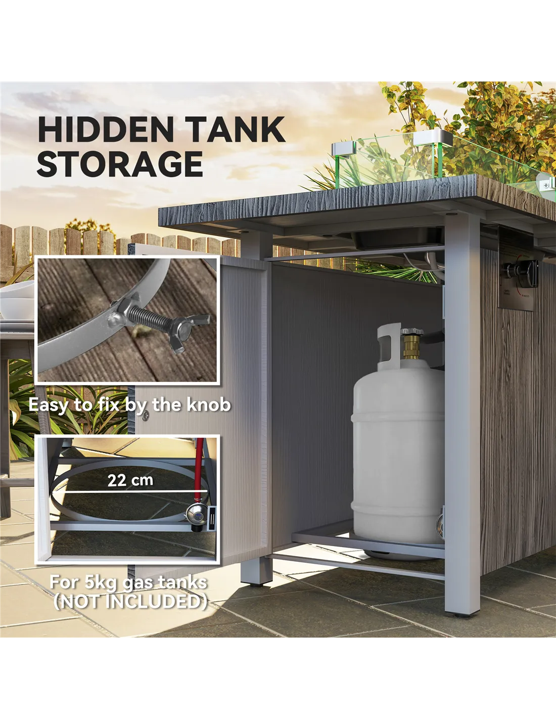- 50,000 BTU burner, gas tank not included. Magnetic door on tank compartment