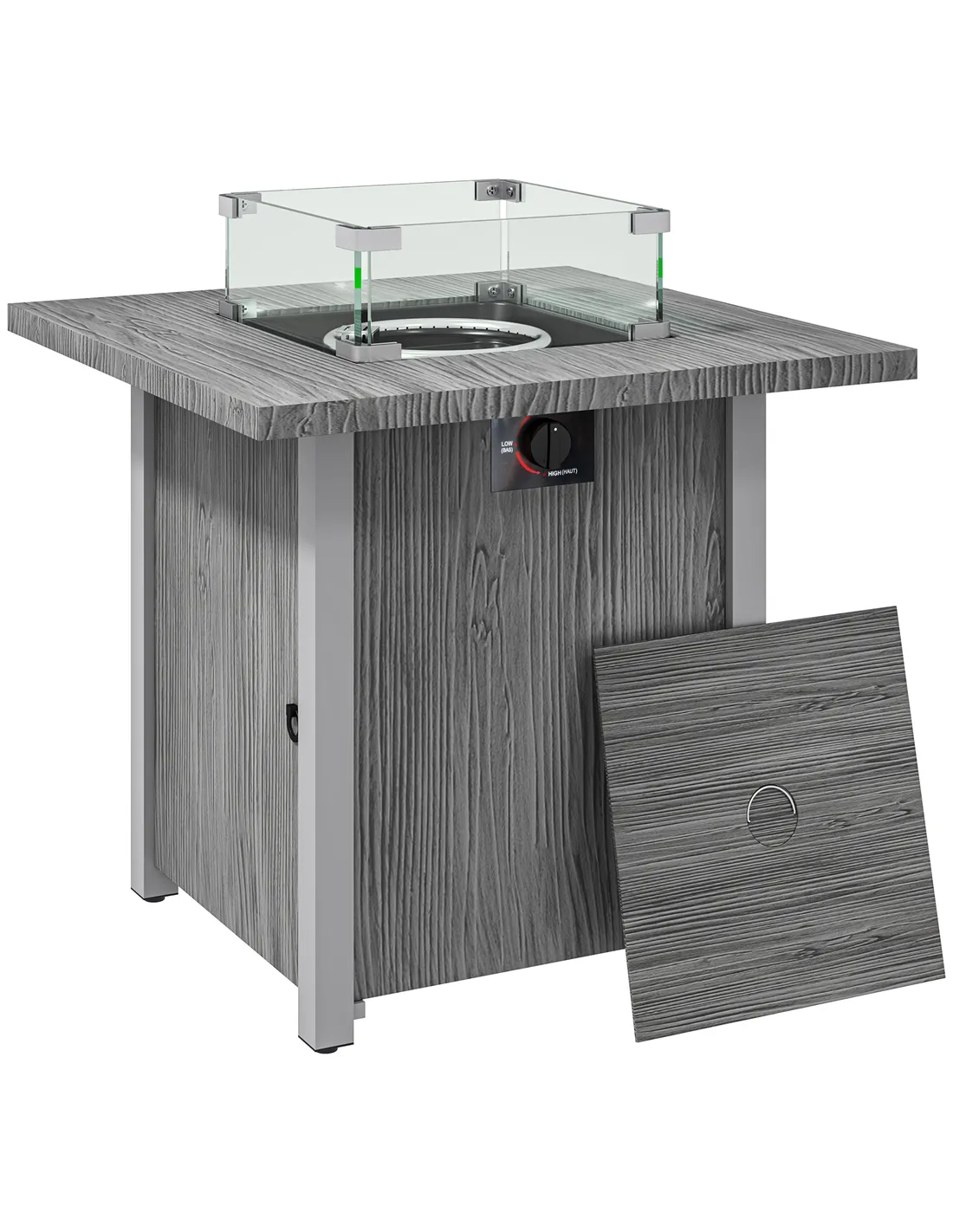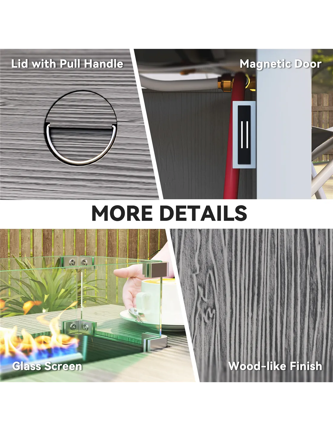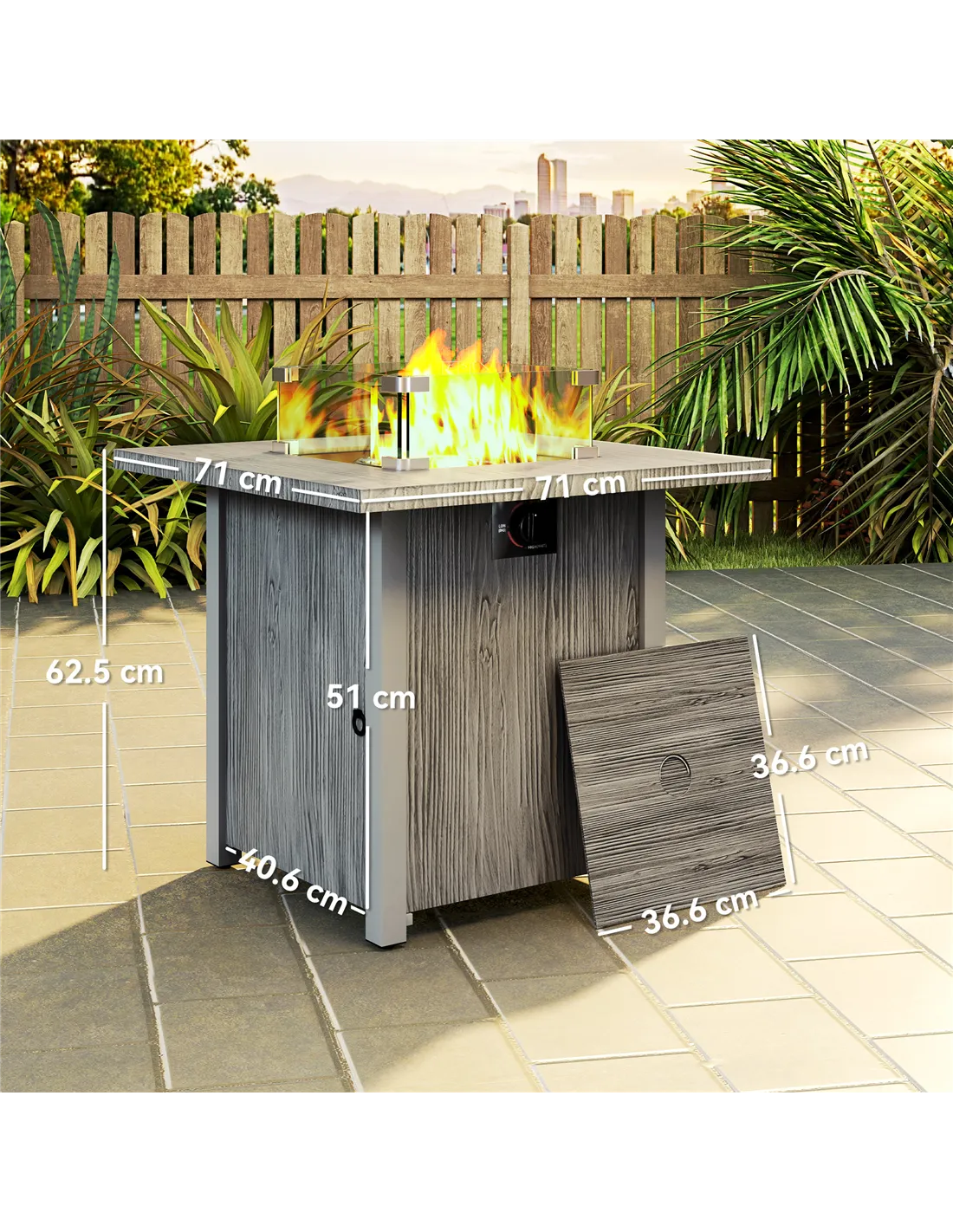 The Outsunny 50,000 BTU Gas Fire Pit Table, with Cover - Dark Grey, is perfect for enhancing your outdoor living space throughout the year. Ideal for cosy evenings in the garden or on the patio, it provides both warmth and ambience while serving as a stylish dining surface for 2 to 4 people. Use it to create a welcoming atmosphere during social gatherings, alfresco dinners, or quiet nights under the stars. The adjustable flame and glass bead feature ensure consistent heat retention, making it a practical addition for chilly British evenings. Its sleek, wood-effect finish complements a variety of outdoor décors, while the protective glass screen offers safety without compromising on style.