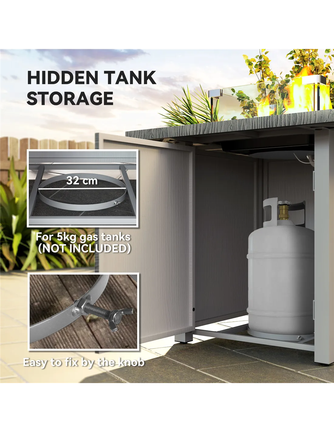 - 40,000 BTU burner, gas tank not included. Magnetic door on tank compartment