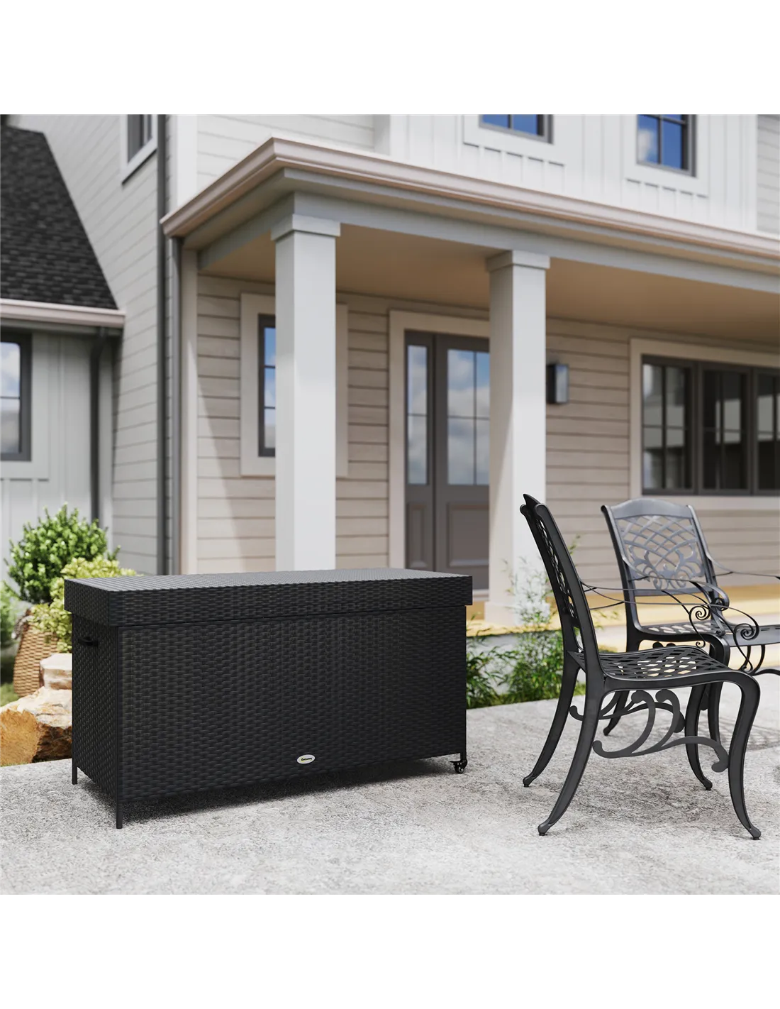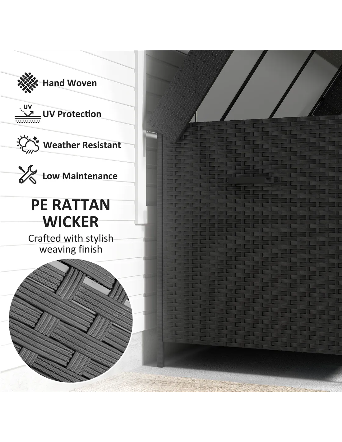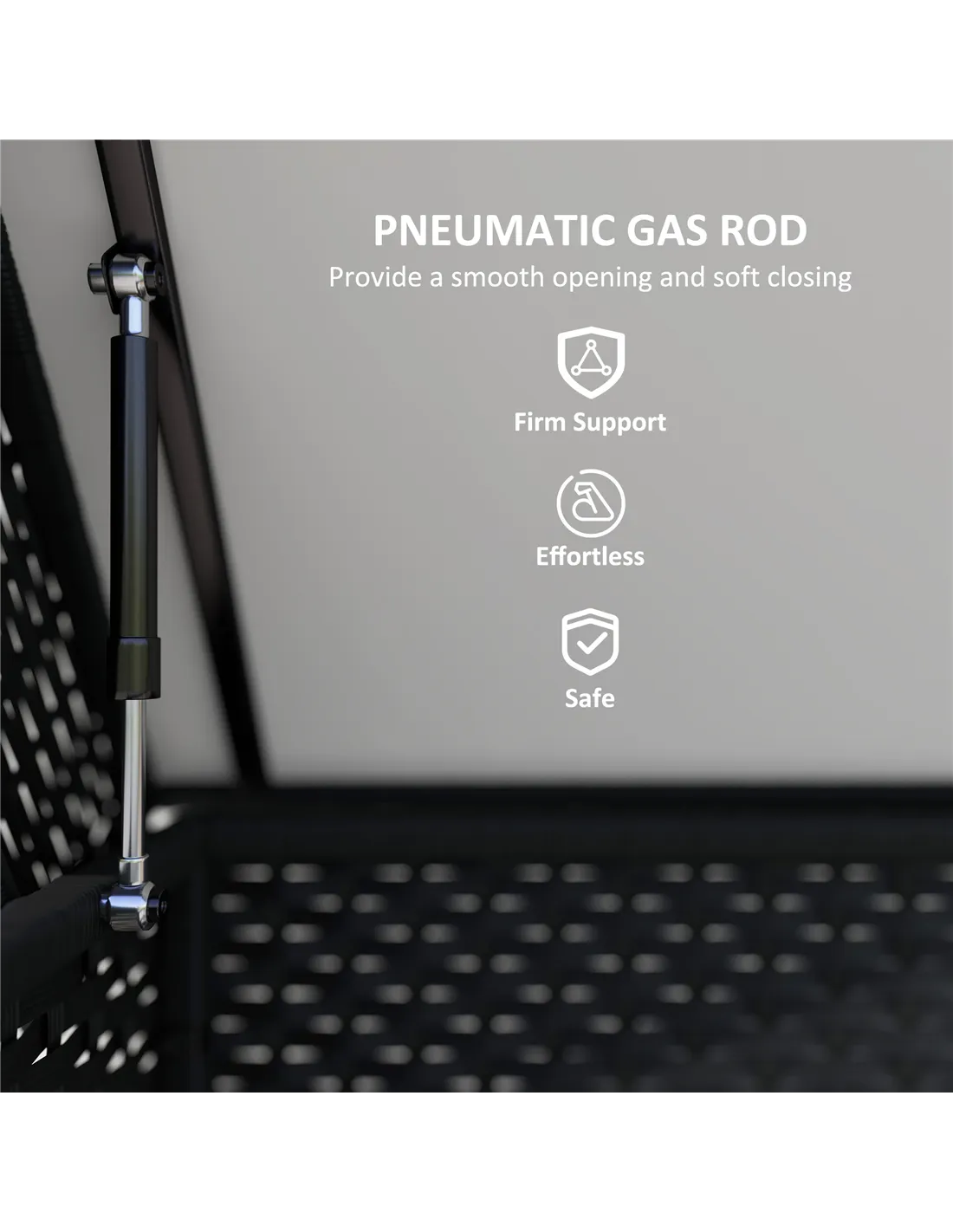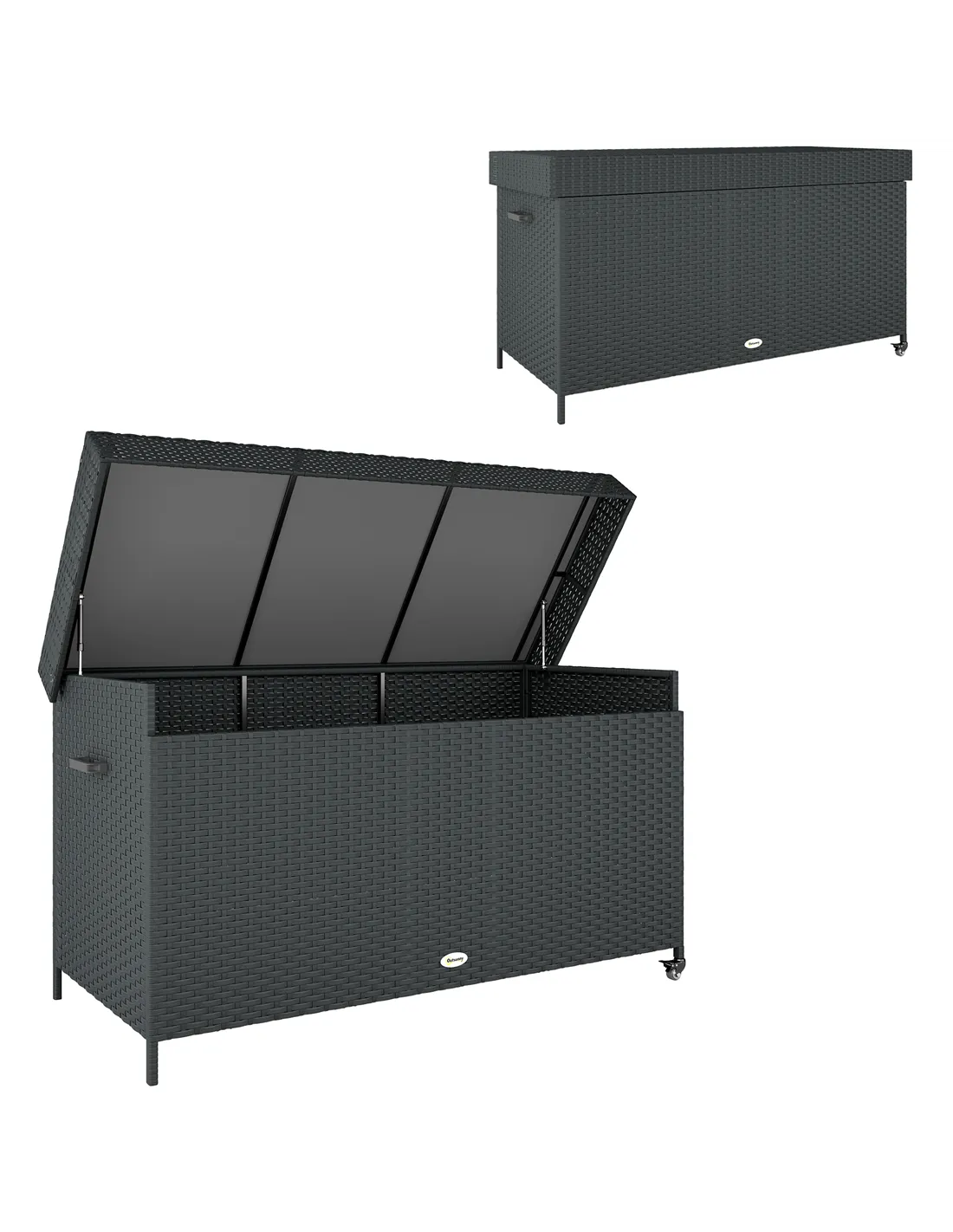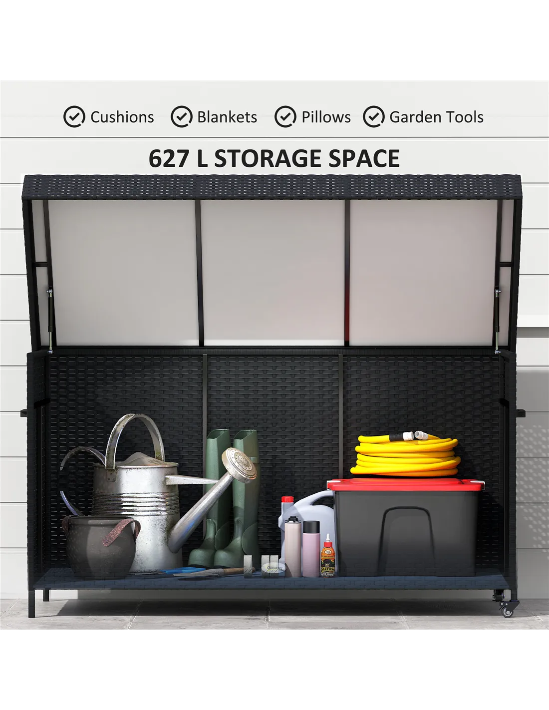 This Outsunny 627 L garden storage box is a safe, protective place for garden tools, supplies and other accessories. Fitted with a gas strut lift mechanism to ensure the lid opens and closes safely and steadily. A powder coated steel frame means a strong core, wrapped in stylish and tough plastic rattan. Complete with a handle and two wheels to move around, even when heavy.