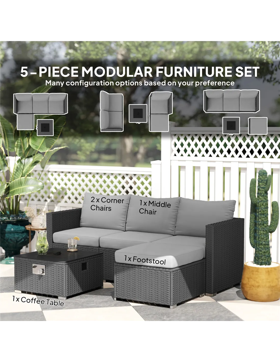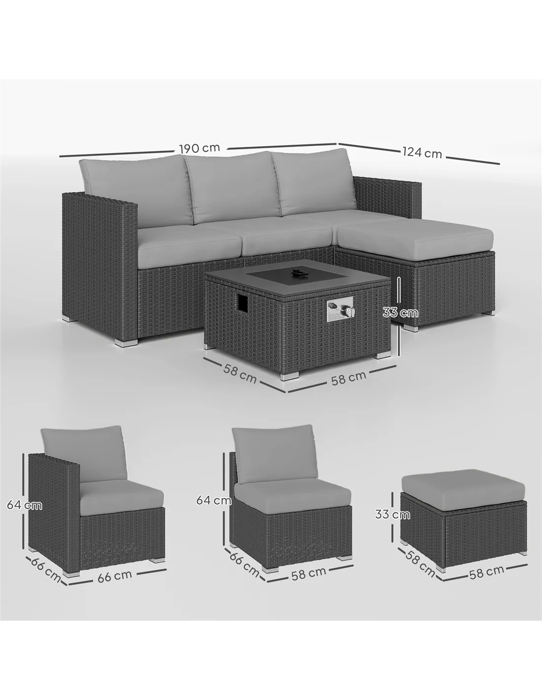Transform your garden into a cosy haven through the corner garden furniture with fire pit table from Outsunny. This modular outdoor sofa set includes two corner chairs, a middle chair, a footstool and a square table, crafted from all-weather three-strand PE rattan on a robust steel frame. The highlight? A gas fire pit table doubles as a coffee table, ensuring warmth and style in your outdoors. Whether hosting friends or enjoying a quiet moment, the Outsunny rattan sofa set enhances your space.