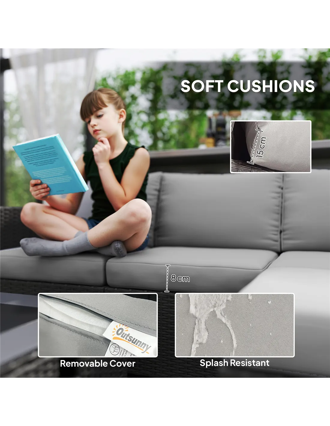 - Thick cushions with removable covers for easy cleaning, splash-resistant fabric without worrying about drink spills