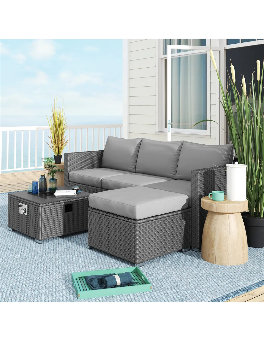 - Fire pit table doubles as a coffee table