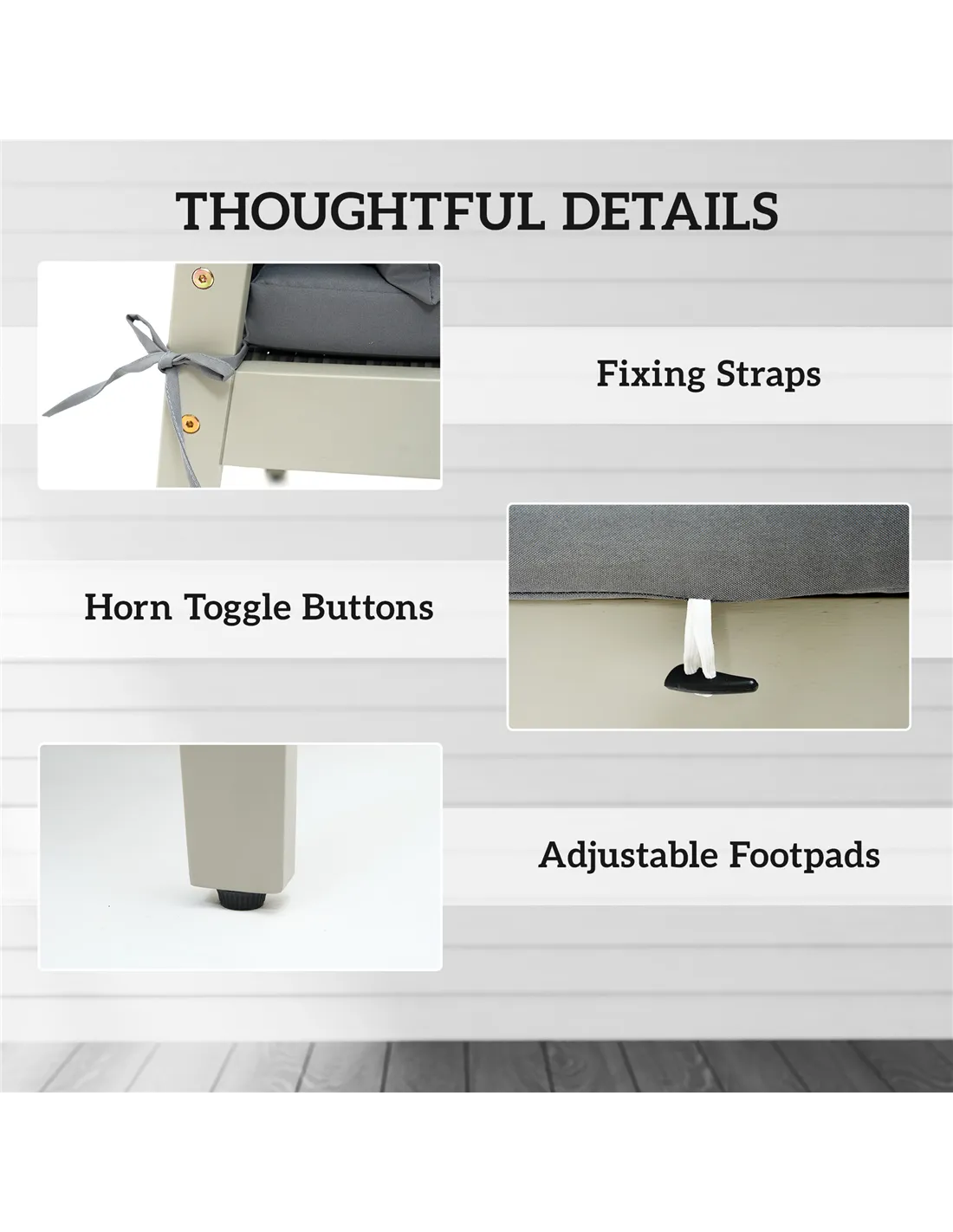 - Horn toggle buttons keep footstool cushions securely in place