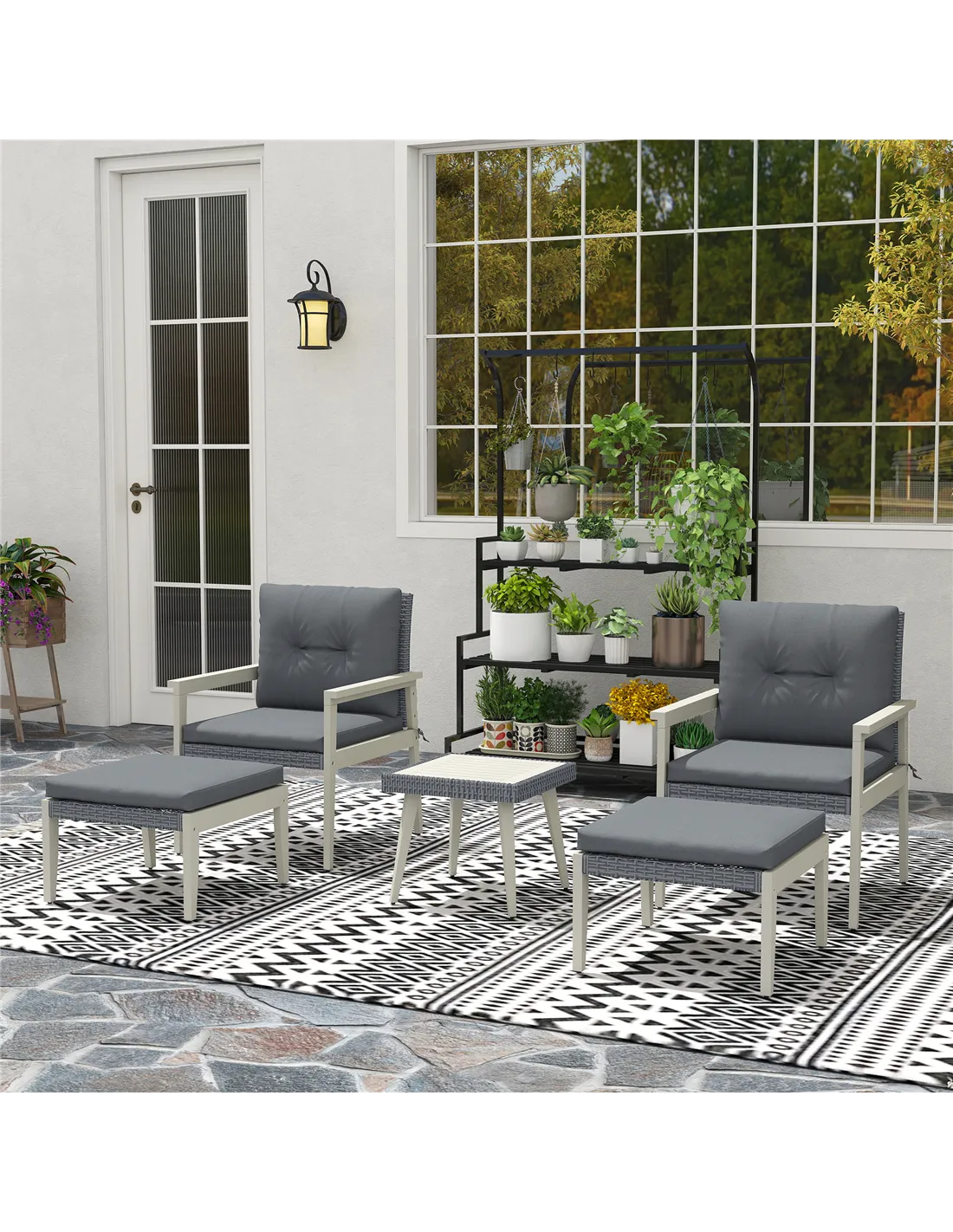 The Outsunny five-piece rattan patio set with a wood-top table is perfect for creating a cosy outdoor retreat in your garden, patio, or balcony. Ideal for morning coffees, afternoon teas, or relaxed evening chats, this set comfortably accommodates two people with additional footstools that double as extra seating or side tables. The elegant grey rattan and natural acacia wood finish complement a variety of outdoor décors, making it a versatile choice for both modern and traditional settings. Use the footstools to rest your feet after a long day or as convenient surfaces for drinks and snacks during social gatherings. According to customer feedback, many appreciate how this set transforms small outdoor spaces into inviting lounges, enhancing both comfort and style.