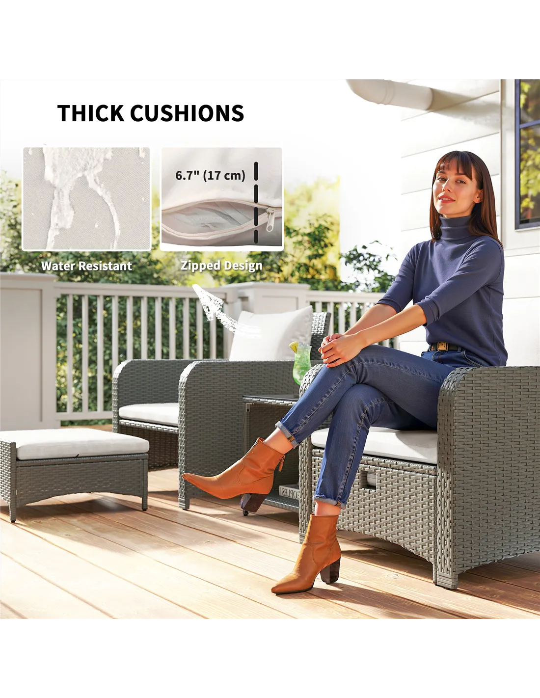 - Cushion Thickness: 5 cm (seat/footstool), 17 cm (back)