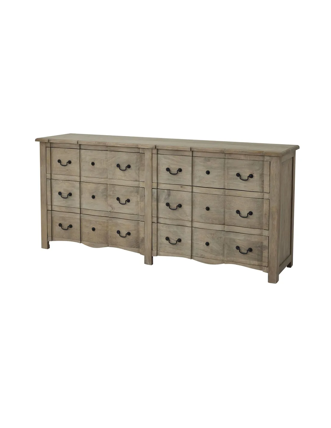 This exceptional chest merges French provincial charm with modern sensibility, showcasing six spacious drawers adorned with distinctive black ironwork handles. The carefully selected hardwood construction features a unique washed and bleached finish that adapts seamlessly to diverse interior styles. Each piece is individually shaped in a design exclusive to Hill Interiors, ensuring authenticity and lasting quality. For a cohesive interior scheme, pair with the Copgrove Collection's coordinating pieces including the 3-drawer bedside table, single-drawer console, or round pedestal dining table. The understated palette and artisanal details make this chest an enduring investment for retailers seeking to satisfy design-conscious customers.