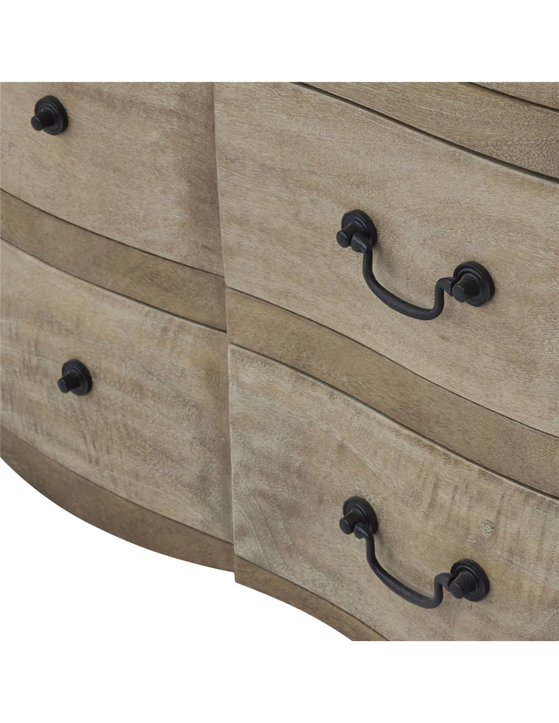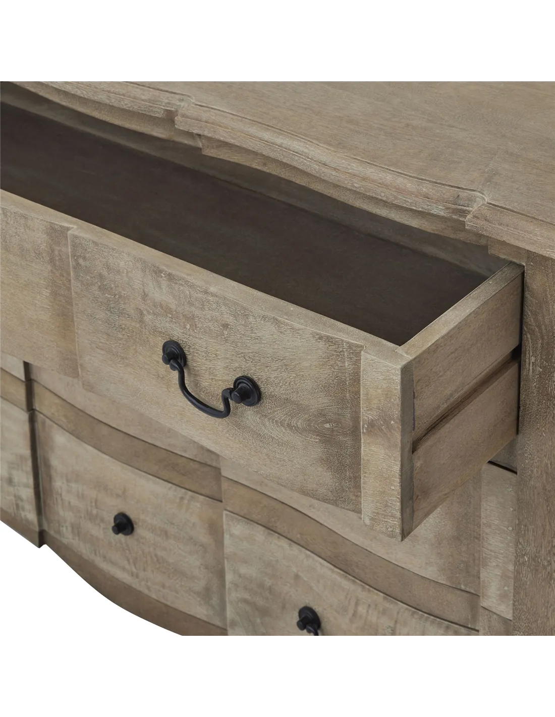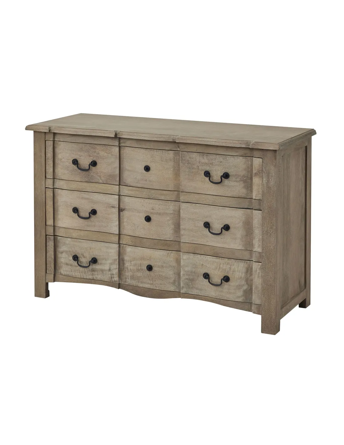 A masterful blend of French provincial charm and modern design sensibilities, this chest exemplifies the perfect marriage of form and functionality. The meticulous attention to detail is evident in the uniquely shaped design, which sets it apart as a bespoke creation exclusive to Hill Interiors. The washed, bleached finish creates a serene, light-catching surface that adapts beautifully to various interior styles, while the black ironwork handles provide a dramatic contrast that anchors the piece visually. Three generously proportioned drawers offer abundant storage possibilities, concealed behind the carefully crafted hardwood facade. The distinctive aesthetic of this chest makes it an ideal centerpiece for curated retail displays, especially when paired with complementary accessories from the collection. For maximum visual impact, we recommend displaying alongside the Chico Black Large Wire Mirror, which echoes the dark accents of the handles. The Ice Shadows Table Lamp with Navy Blue Lampshade and Leptis Magna Table Lamp offer perfect lighting companions, their refined silhouettes harmonizing with the chest's graceful proportions. The Copgrove Collection Arched Paned Wall Mirror provides an additional reflective element that enhances the chest's presence while maintaining the collection's cohesive design language. This piece represents an investment in quality that will resonate with discerning customers who value authenticity and enduring style.