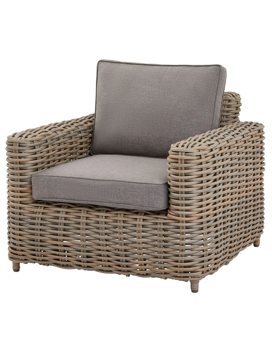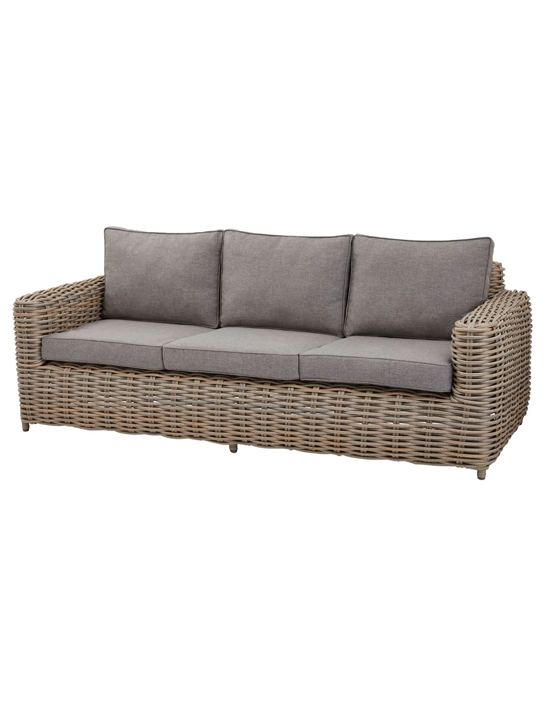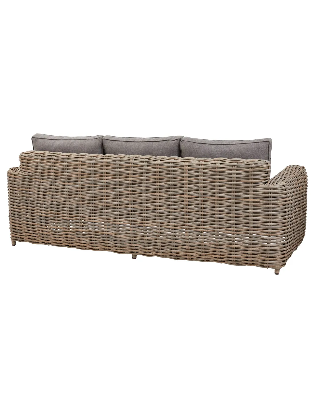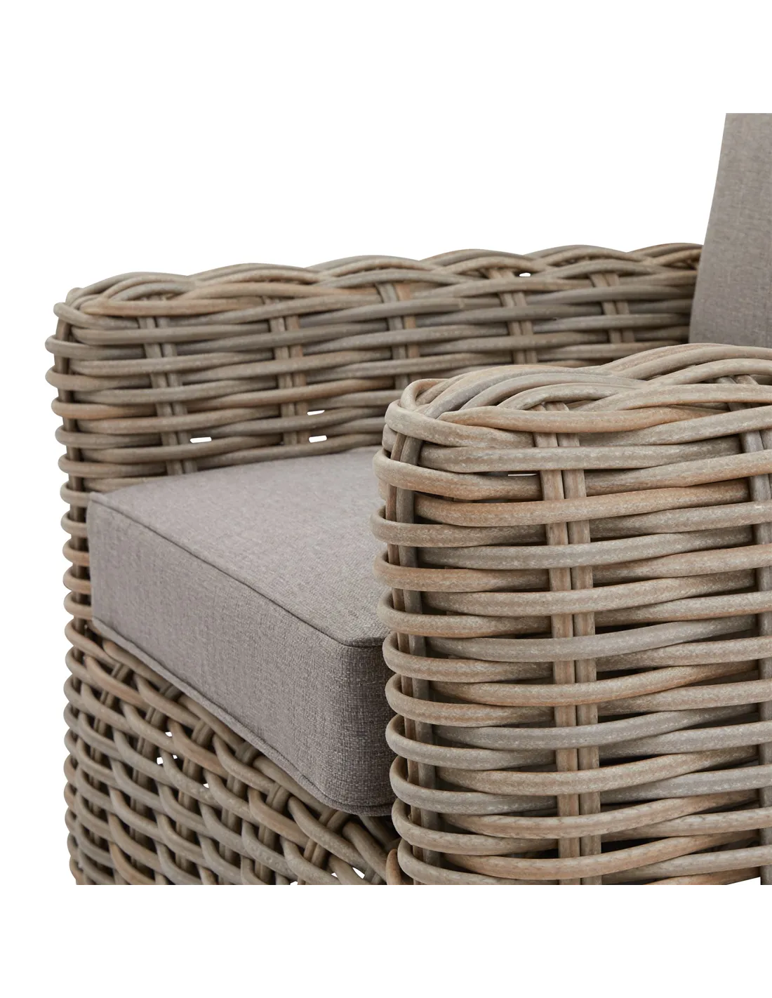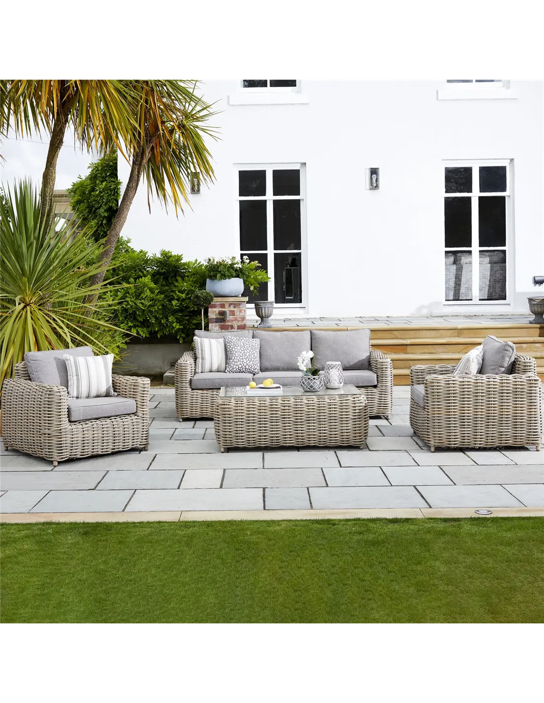 Embrace outdoor living with this meticulously designed five-seater set that combines authentic appearance with unmatched resilience. The round 12mm HDPE wicker weave creates an organic pattern that mimics natural materials while surpassing them in durability and weather resistance. The lightweight aluminum frame provides stability without compromising on portability, while the powder coating ensures long-term protection against environmental factors. The addition of grade 5 Olefin fabric cushions delivers superior comfort and practicality - their quick-drying properties and resistance to UV damage make them ideal for outdoor settings. The eco-conscious hardwood acacia coffee table crowned with tempered glass adds both functionality and refinement to the arrangement. For a coordinated outdoor aesthetic, consider pairing this set with the Pula or Leptis Magna table lamps for ambient evening lighting, or enhance the visual appeal with the Black Wood Round Framed Mirror or Washed Wood Window Mirror to create depth and reflection in your outdoor space. This collection maintains its fresh appearance with minimal maintenance - simple soap and water cleaning for the wicker and easy-care cushions that can be removed as needed. The set's year-round outdoor capability, combined with its shower-resistant and color-fast properties, ensures lasting value for retailers and customer satisfaction. Individual sizes Armchair: 90 x 92 x 72cm 3 Seater 210 x 92 x 72cm Table 120 x 63 x 42cm. Seat height is 59cm.