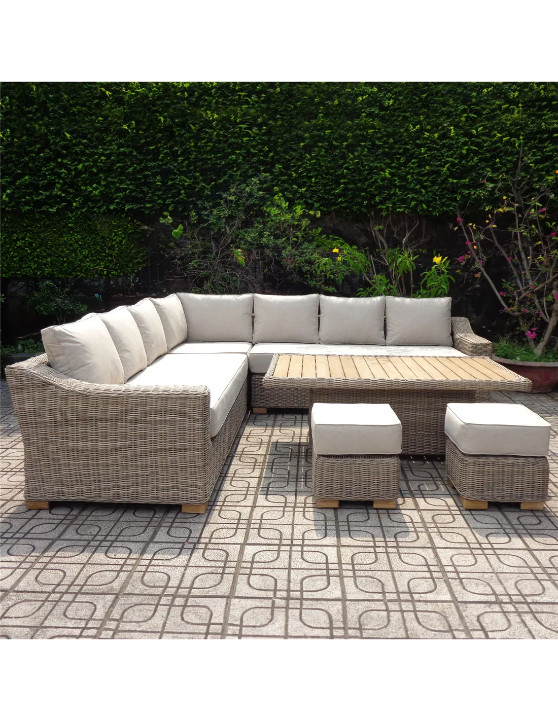 - While it is a large corner set, its modular design allows flexible placement. The neutral beige colour and compact stools help it blend well even in more modest garden or patio areas.