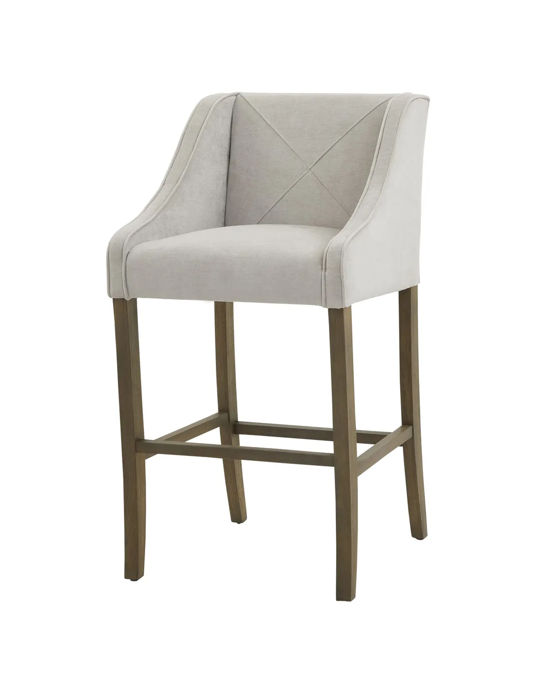 This is the Epsom Grey Barstool. Its rubberwood frame, known for its dense grain and strength, is the perfect choice for its intended everyday use. Upholstered in a light grey woven fabric that will tie in with any number of decor schemes, this barstool exudes an effortless "quiet luxury" that is so sought after across fashion and interiors alike right now. Its piped details add to the luxe look.