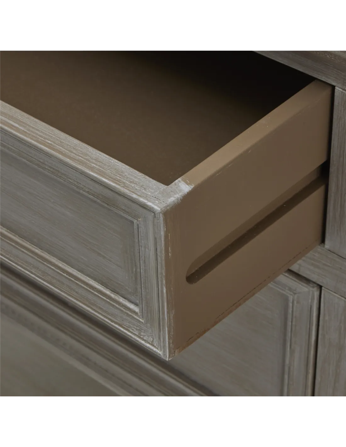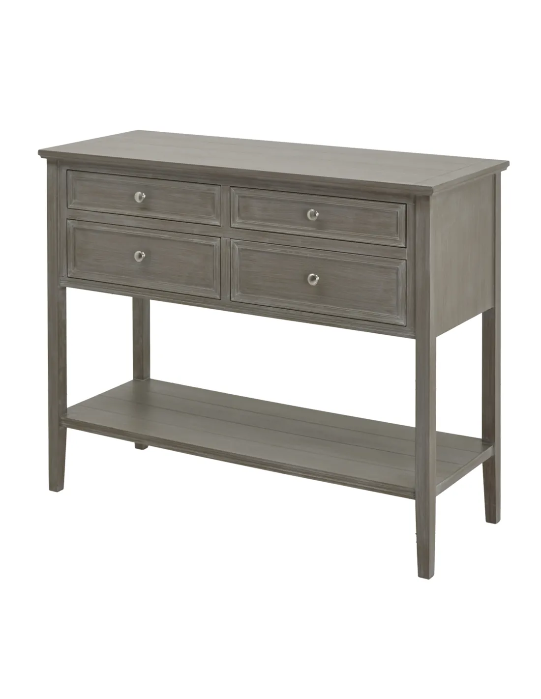 - The console is crafted from durable wood, finished in a neutral grey tone that enhances its timeless appeal and ensures long-lasting quality.