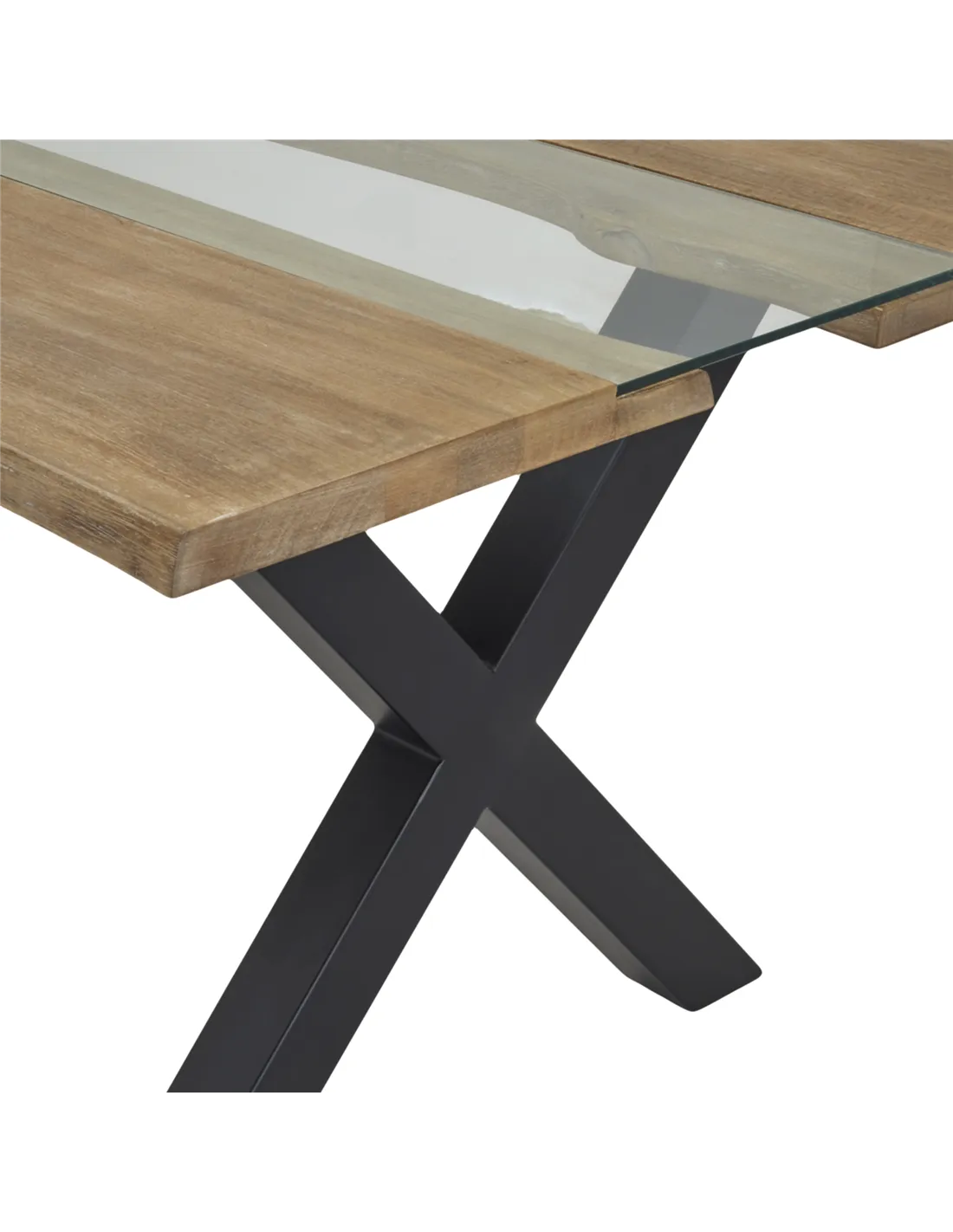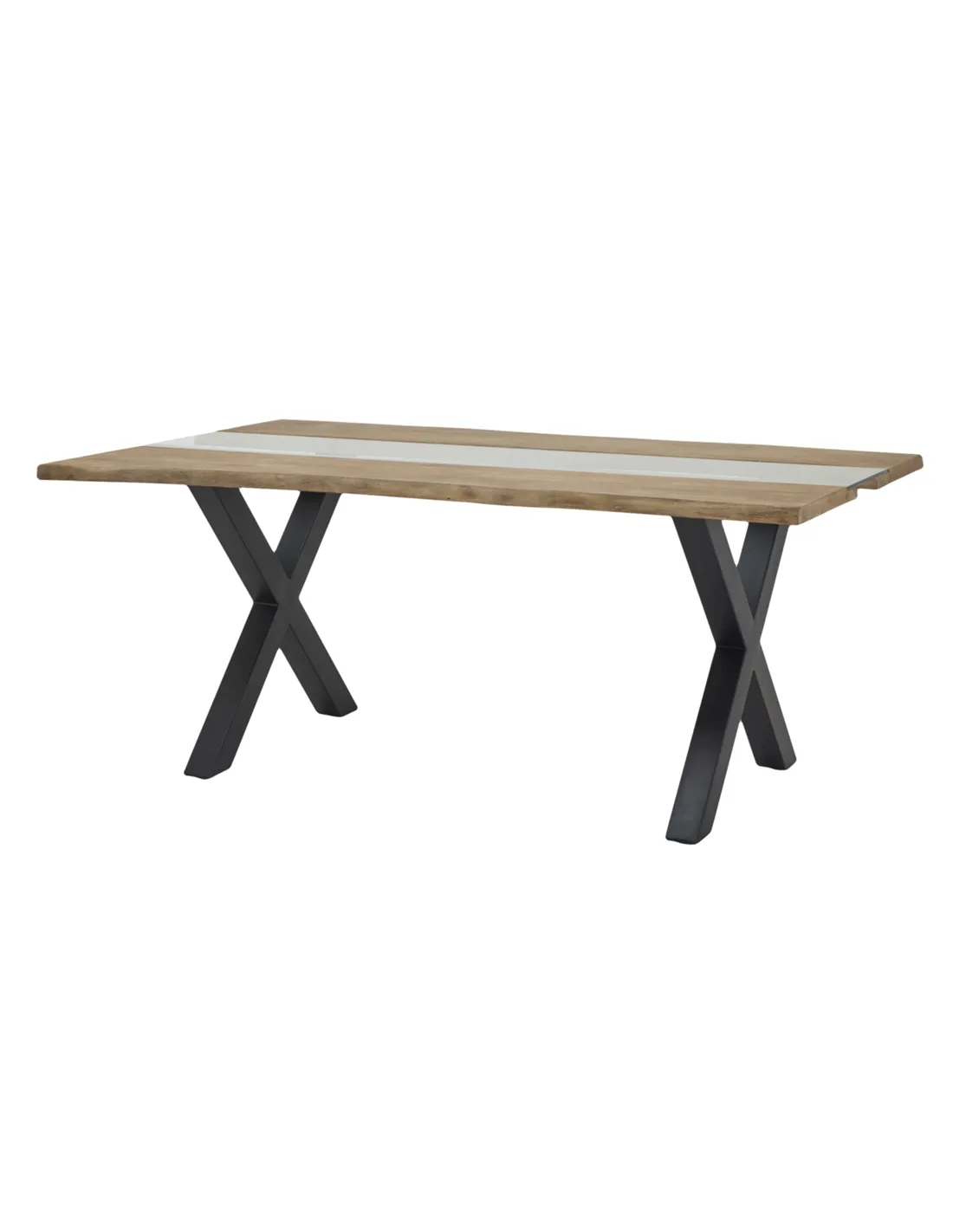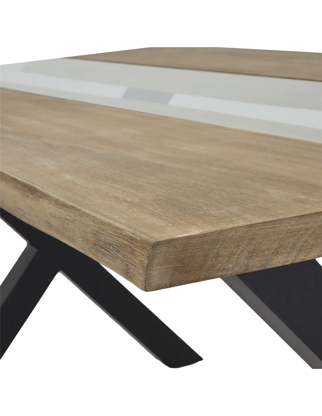 - The table features a solid light acacia wood top with natural river-like grain patterns and a metal base finished in black, combining durability with elegant design.