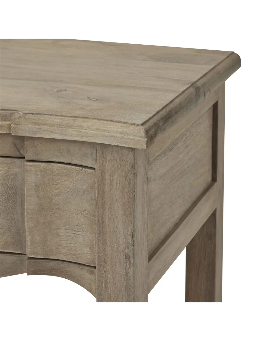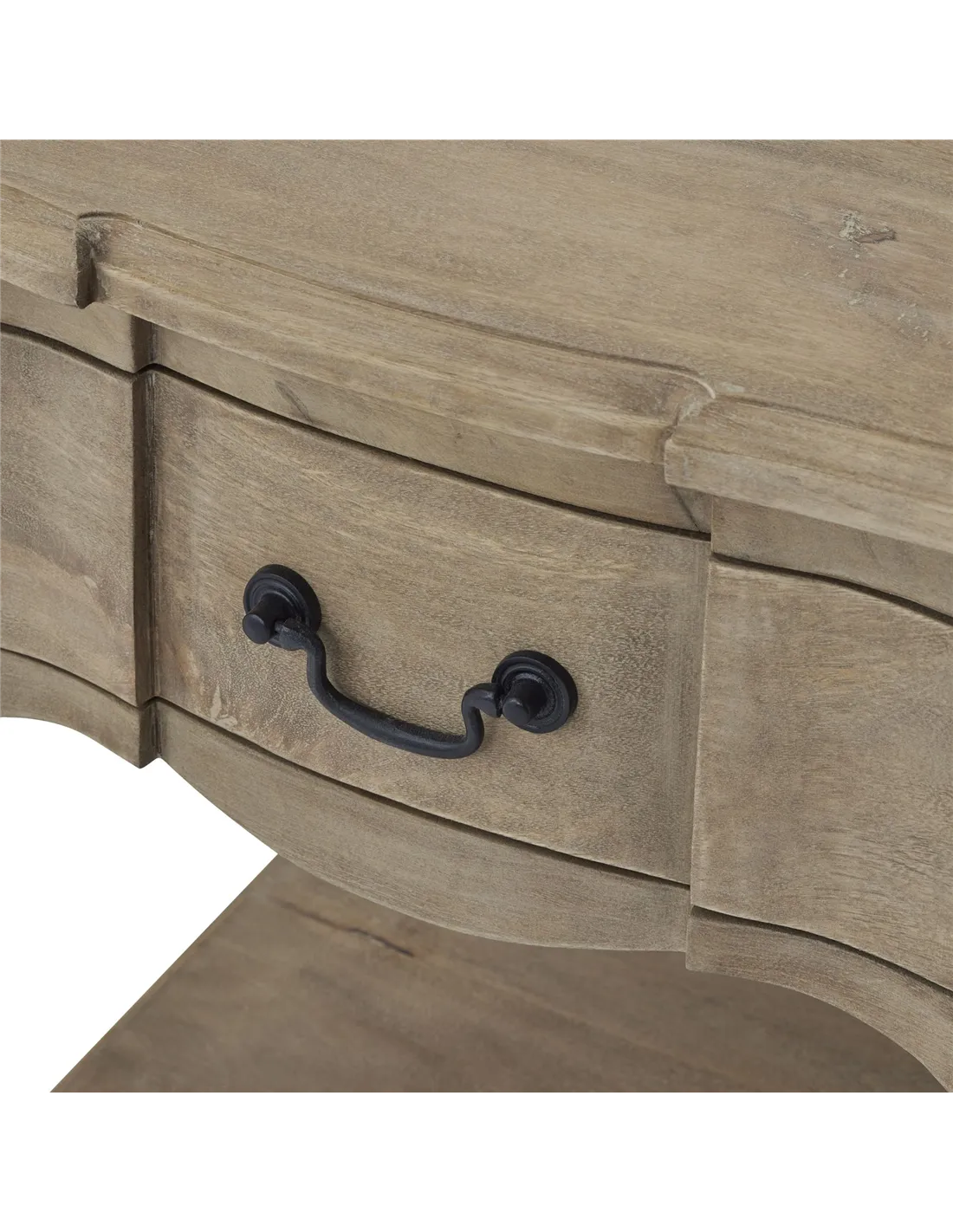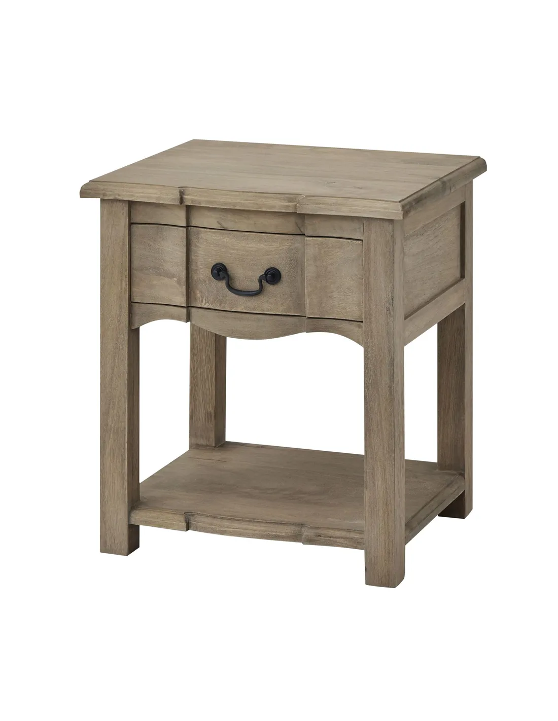 French provincial charm meets modern functionality in this distinctive side table, featuring a washed, bleached wood finish that adds rustic appeal to any interior setting. The full-width drawer and built-in shelf provide practical storage solutions while maintaining visual restraint through clean lines and understated black ironwork handles. Each piece is meticulously crafted from superior hardwood, following a unique design exclusive to Hill Interiors. To enhance the aesthetic appeal and create a cohesive look, consider pairing this side table with the Ice Shadows Table Lamp featuring a navy blue lampshade, the statement Chico Black Large Wire Mirror, or the industrial-inspired Ithaca Floor Lamp. These carefully selected accessories complement the table's blend of traditional and contemporary elements while adding layers of visual interest to your retail display.