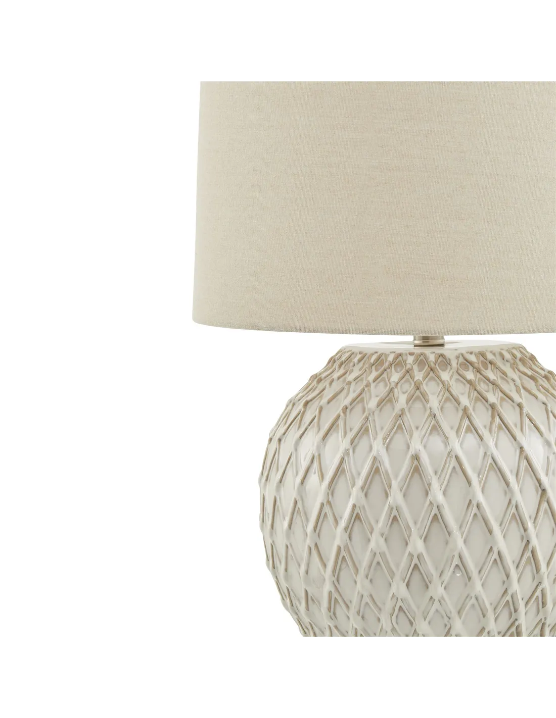 Elevate any space with the exquisite Lattice Ceramic Table Lamp. Crafted with exceptional attention to detail, this stunning piece features an elegant lattice design in a neutral cream hue that creates captivating visual interest. The natural linen shade provides a soft, warm glow, transforming any room with its timeless appeal. Versatile and durable, the Lattice Lamp seamlessly complements a variety of interior styles, from modern minimalist to cozy farmhouse. Its sturdy ceramic construction ensures long-lasting quality, making it a smart investment for your customers.