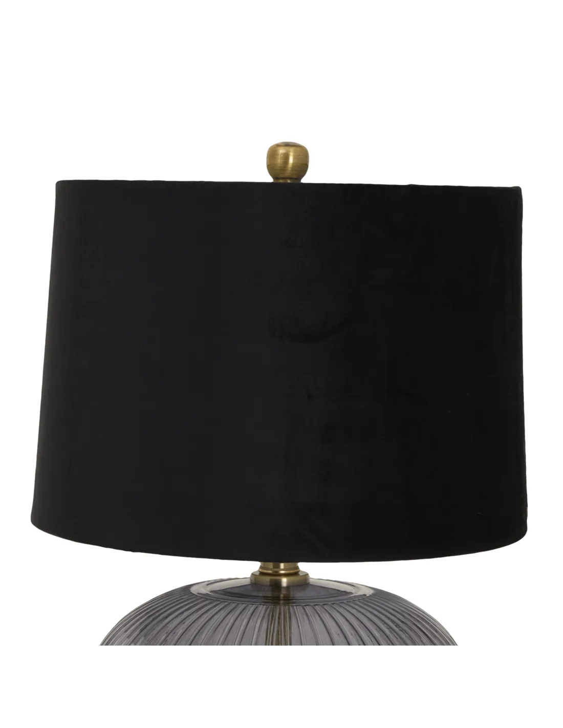 - The black velvet shade softens the light, creating a cosy, ambient glow while providing a striking contrast to the clear ribbed glass base, enhancing the overall aesthetic.