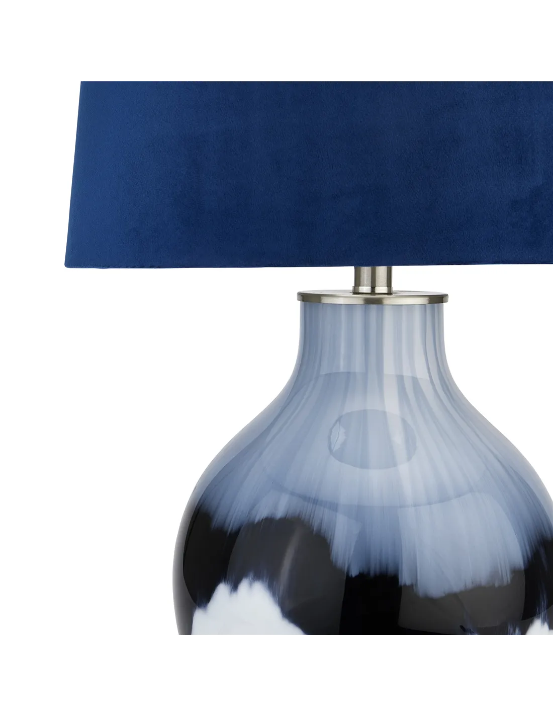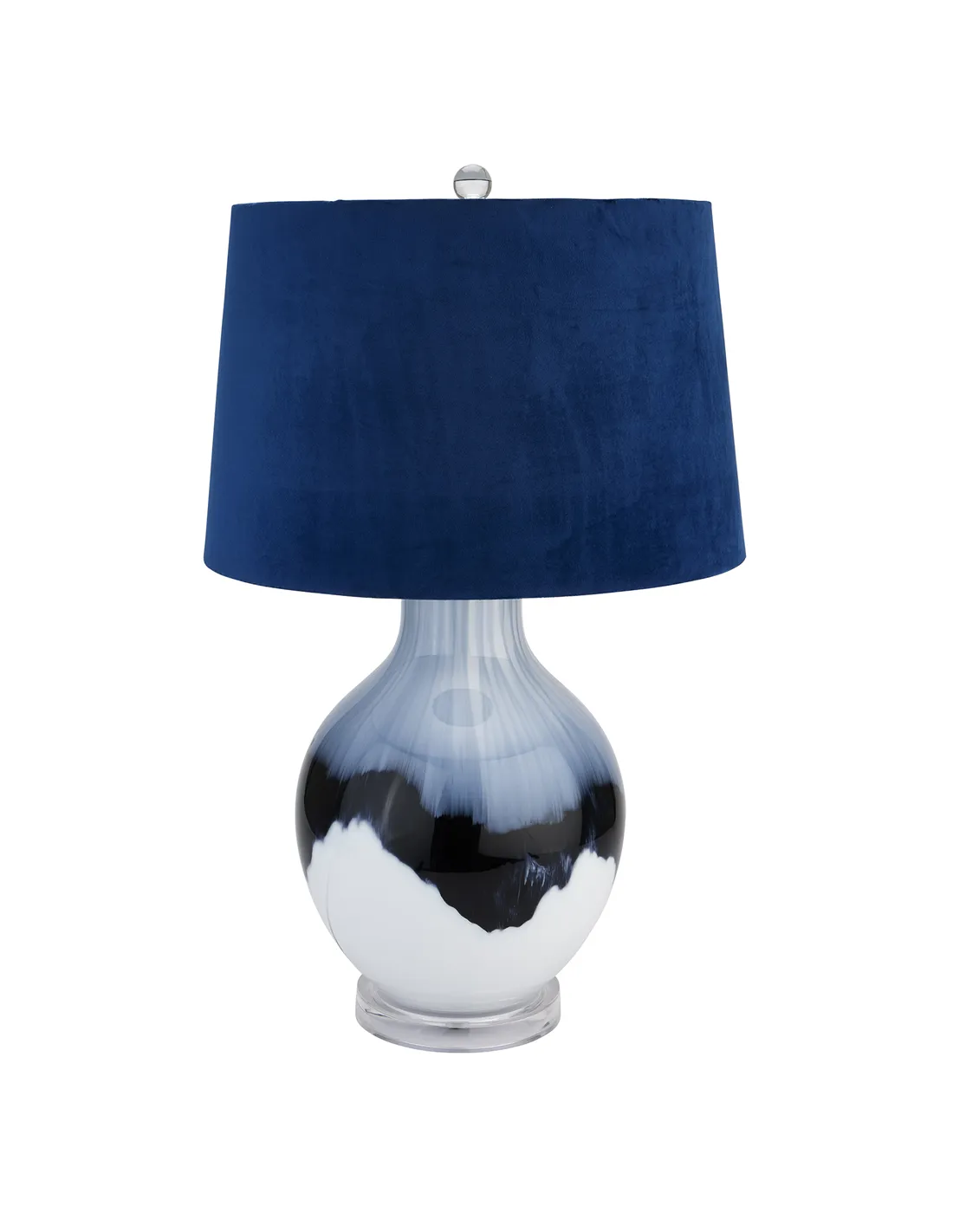 This is the Ice Shadows Table Lamp With Navy Blue Lampshade. This stylish Glass lamp with unique blue and white glaze comes complete with the premium quality ball-topped navy velvet shade, pictured. Each lamp's hand-dipped glaze will be truly unique, making each one all the more special. Brighten up any room with its handcrafted beauty and layer additional texture into a space. E27 Screw Bulb required.
