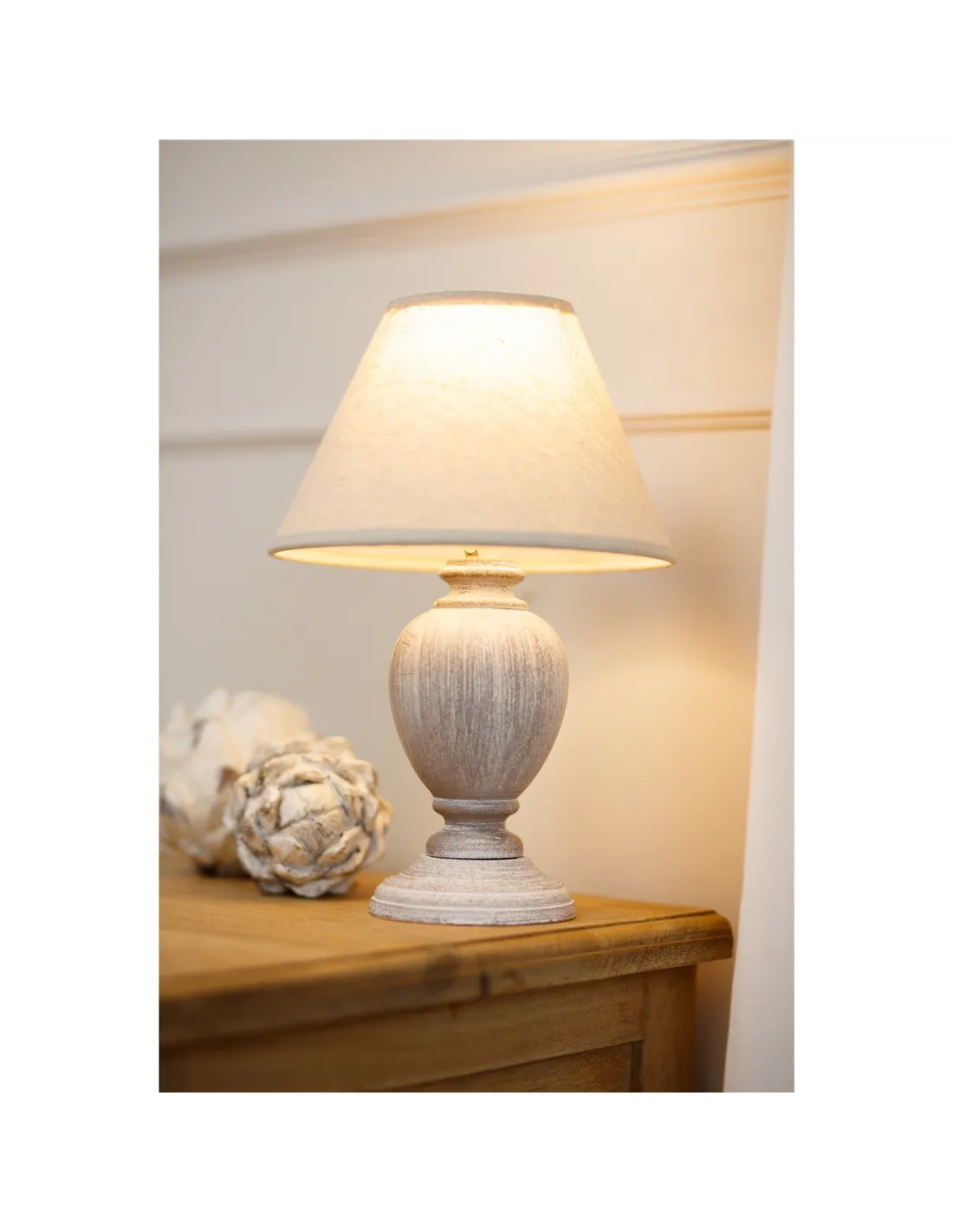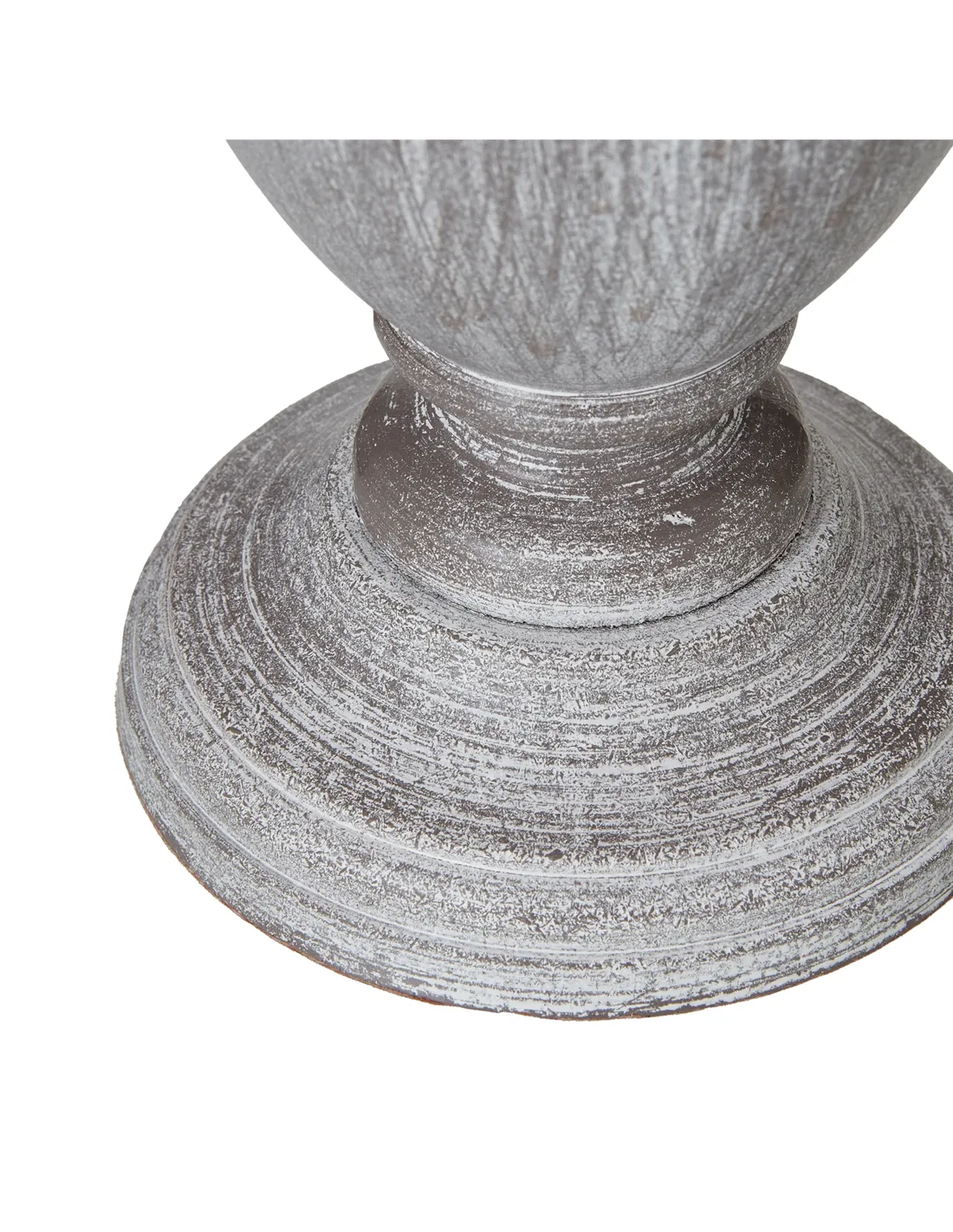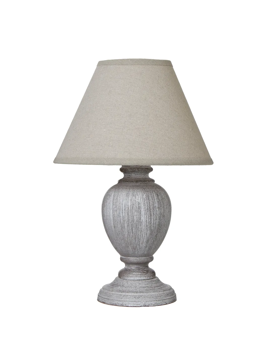 - Thanks to its distressed pewter-toned urn base and neutral linen shade, this lamp complements a variety of décors, from rustic and farmhouse to modern and minimalist interiors.
