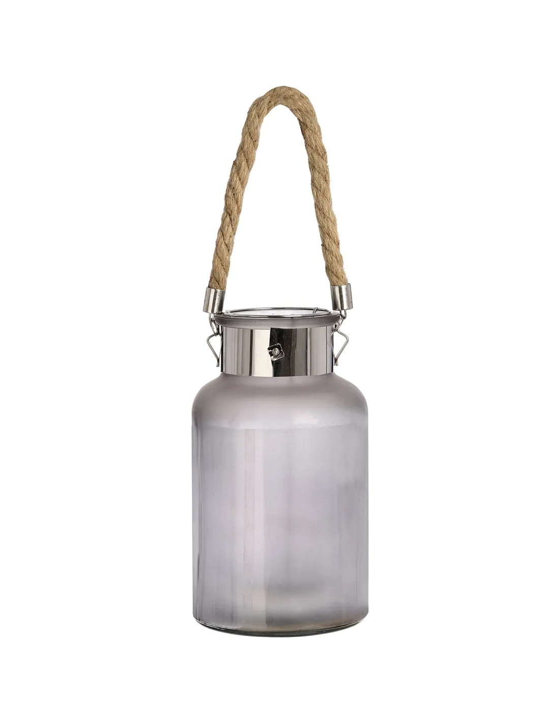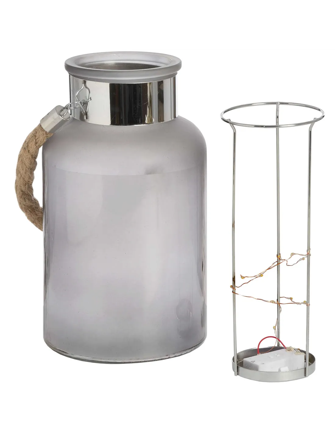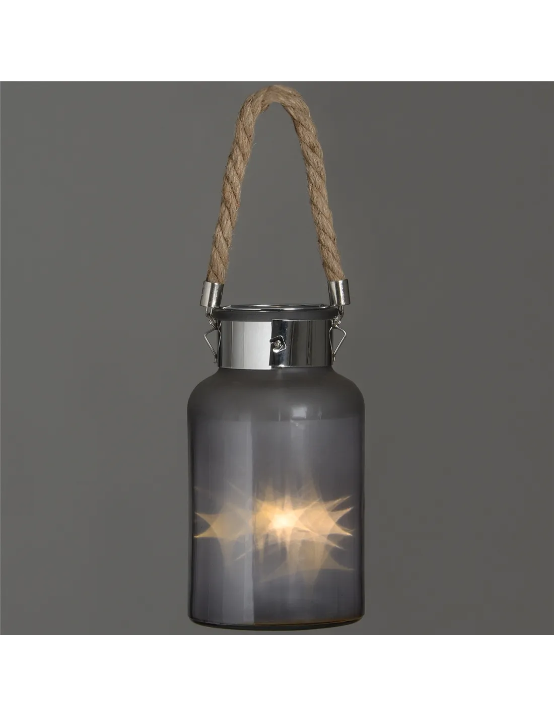 Frosted grey glass lanterns with rope detail handle and internal LEDs. These lanterns are elegant unlit and bewitching when switched on. A string of tiny LEDs coil around any easy to remove metal insert and appear as stars on the jar's exterior thanks to light diffusion from the frosted grey glass. The perfect additions to a create a cosy, atmospheric set-up inside or outdoors. Batteries not included. 2 x AAA needed.