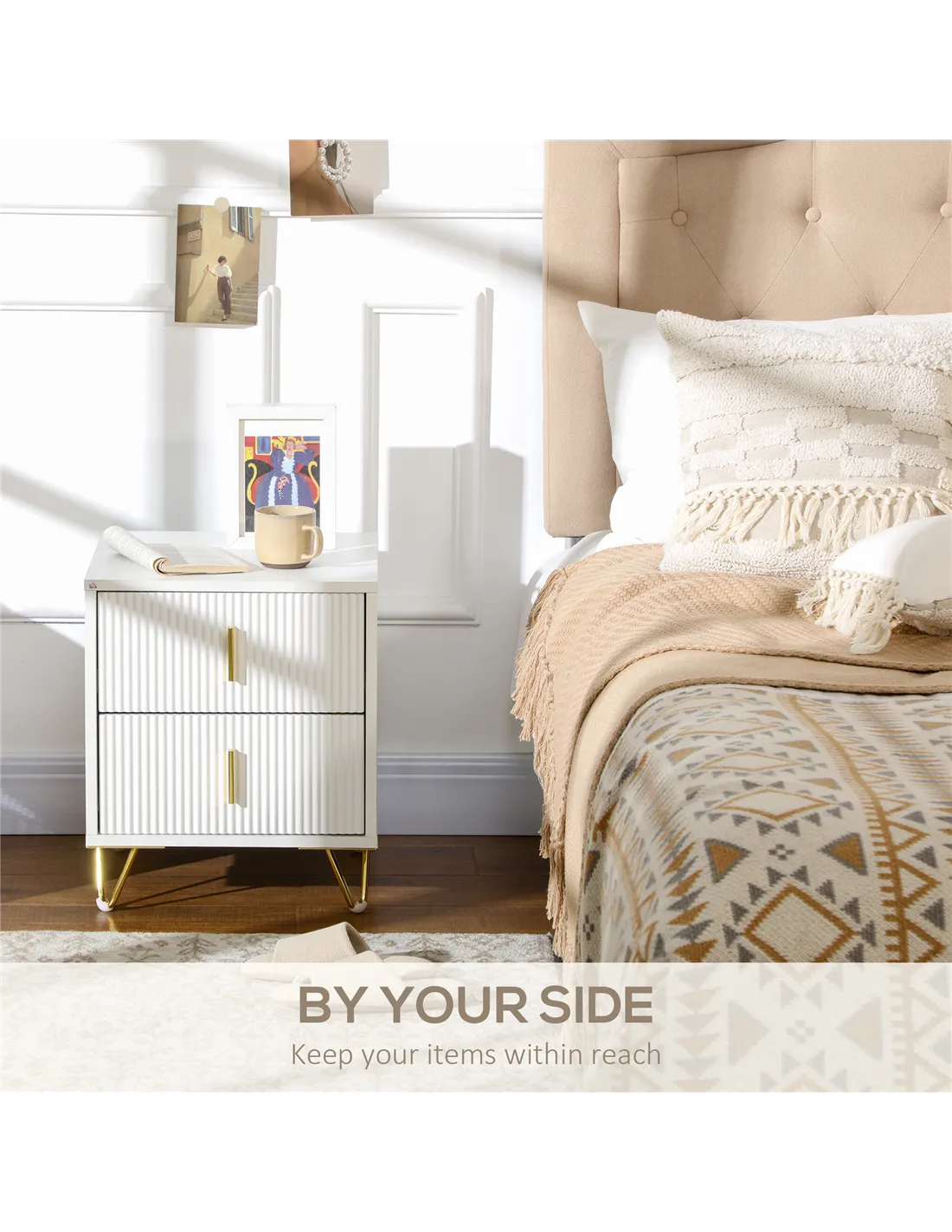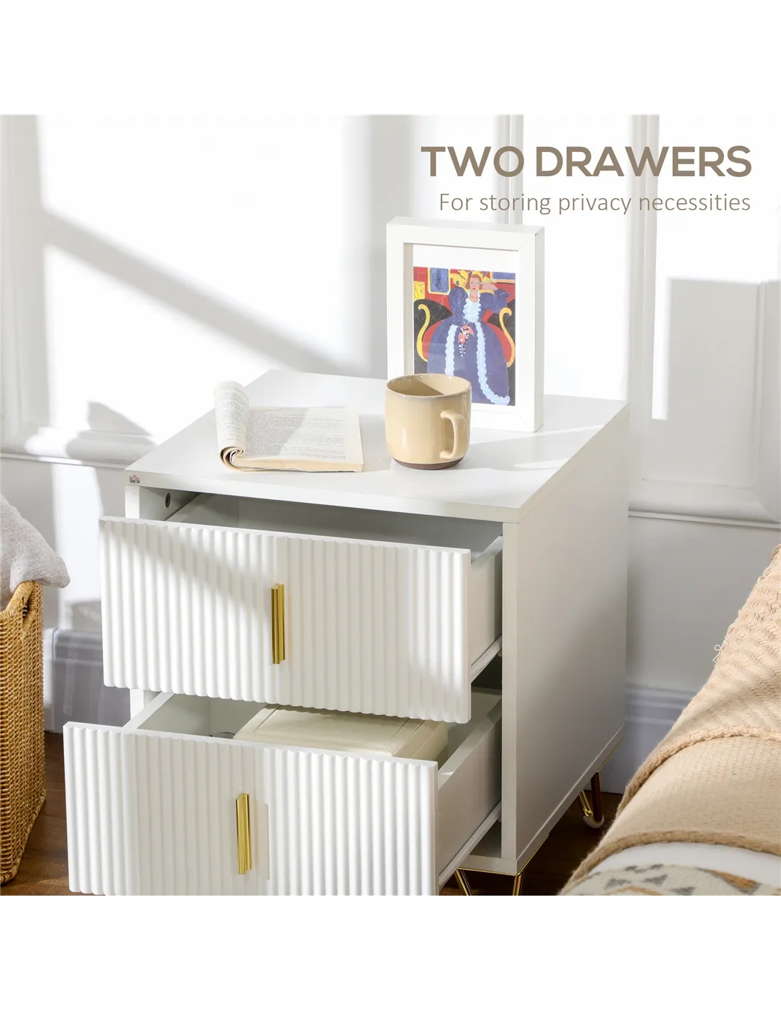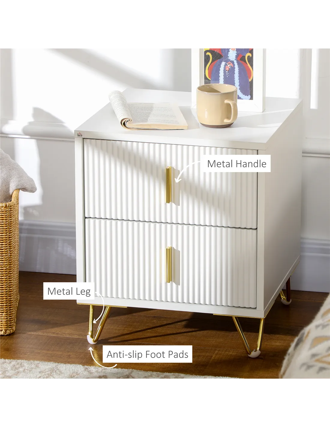 Add a soft touch of elegant texture into the bedroom and beyond, thanks to this HOMCOM dresser. The soft white colour comes with ridged drawer fronts, with gold coloured handles and hairpin legs - this is a beautiful design! With two drawers there's plenty of storage for clothing and more. These white drawers made from a particle board and MDF blend for durability.