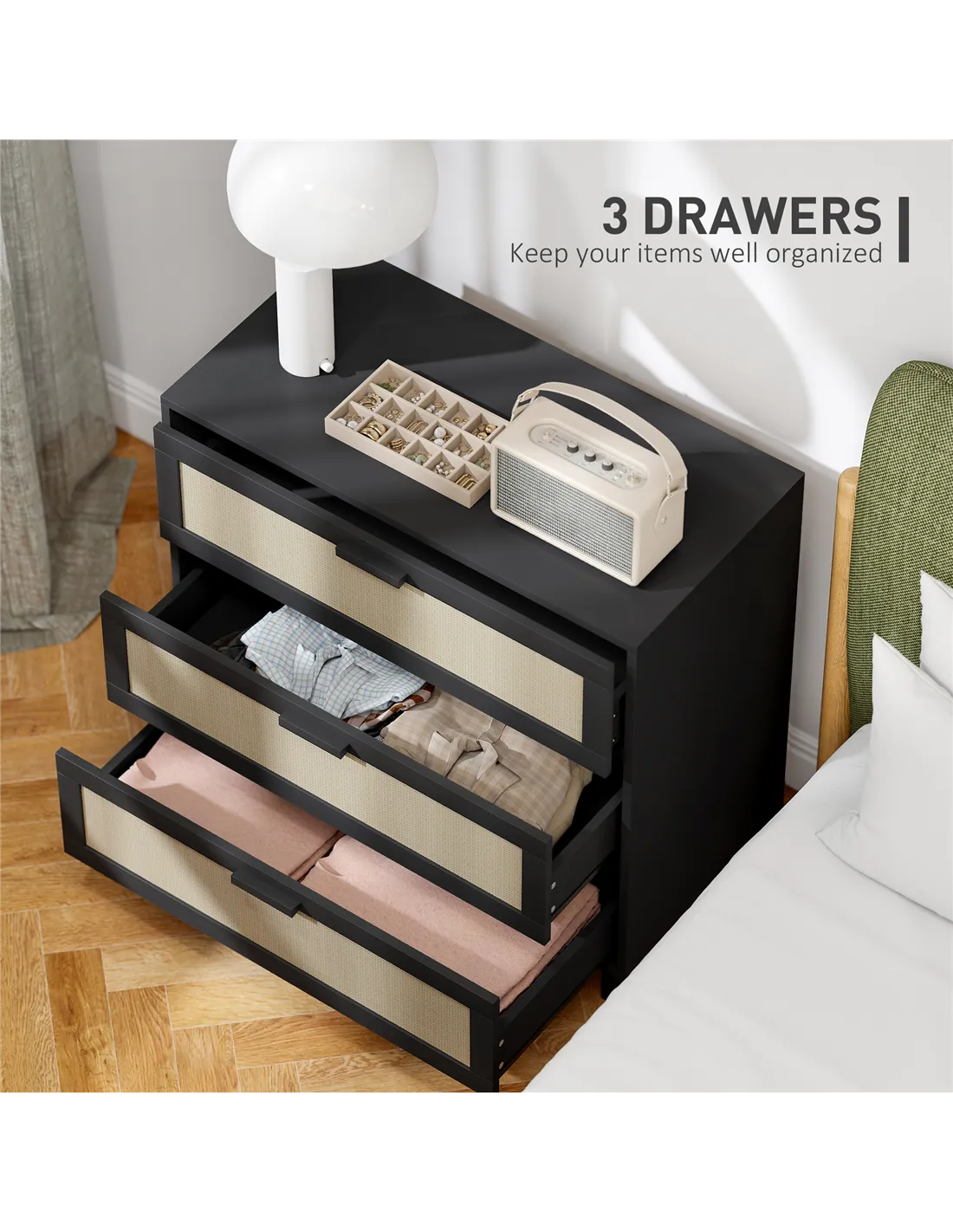HOMCOM Rattan Bedroom Chest of Drawers, 3 Drawers Storage Unit, Boho Dresser for Living Room, Hallway, Black