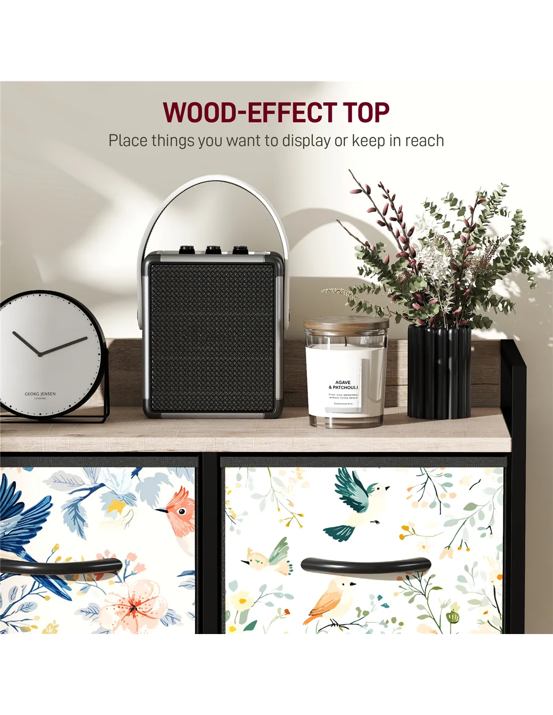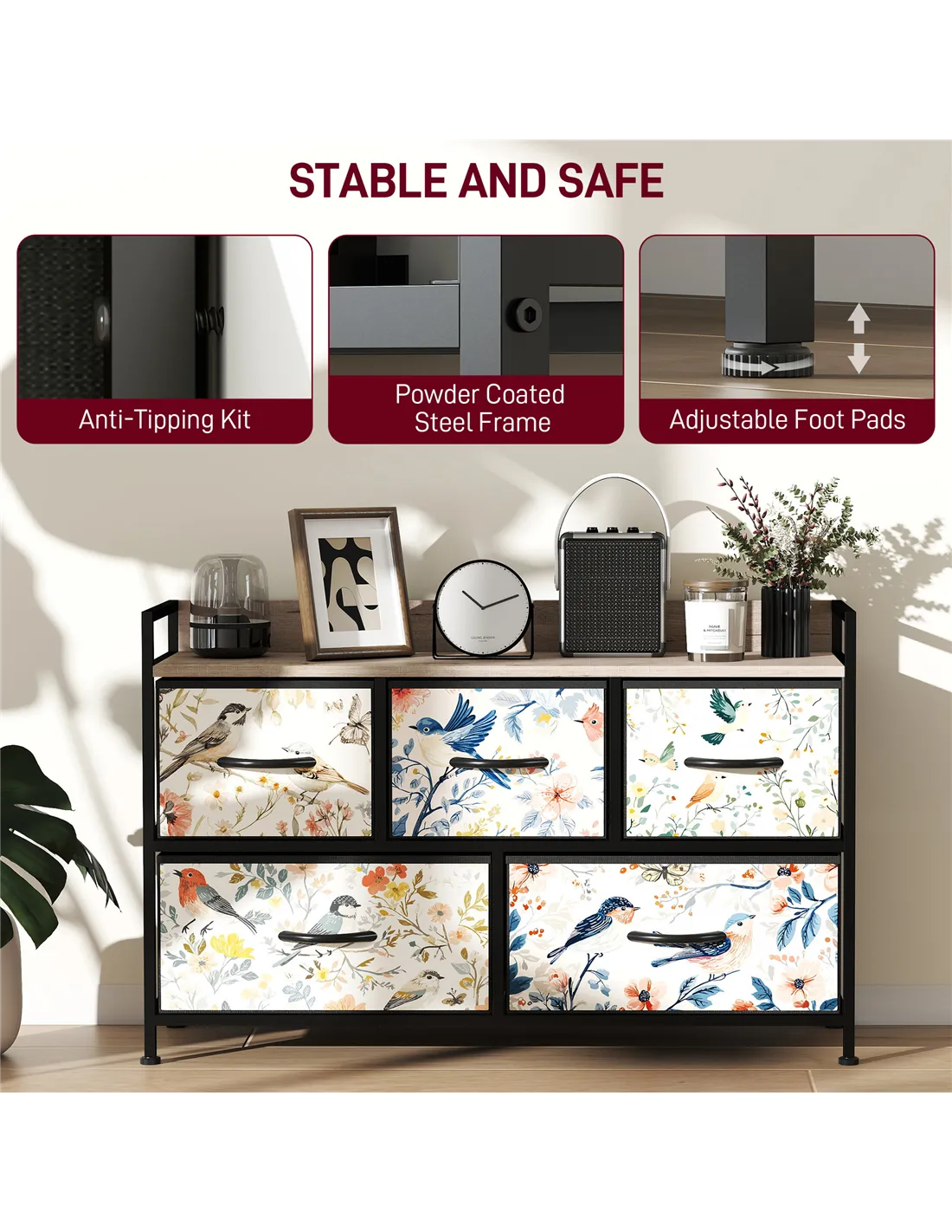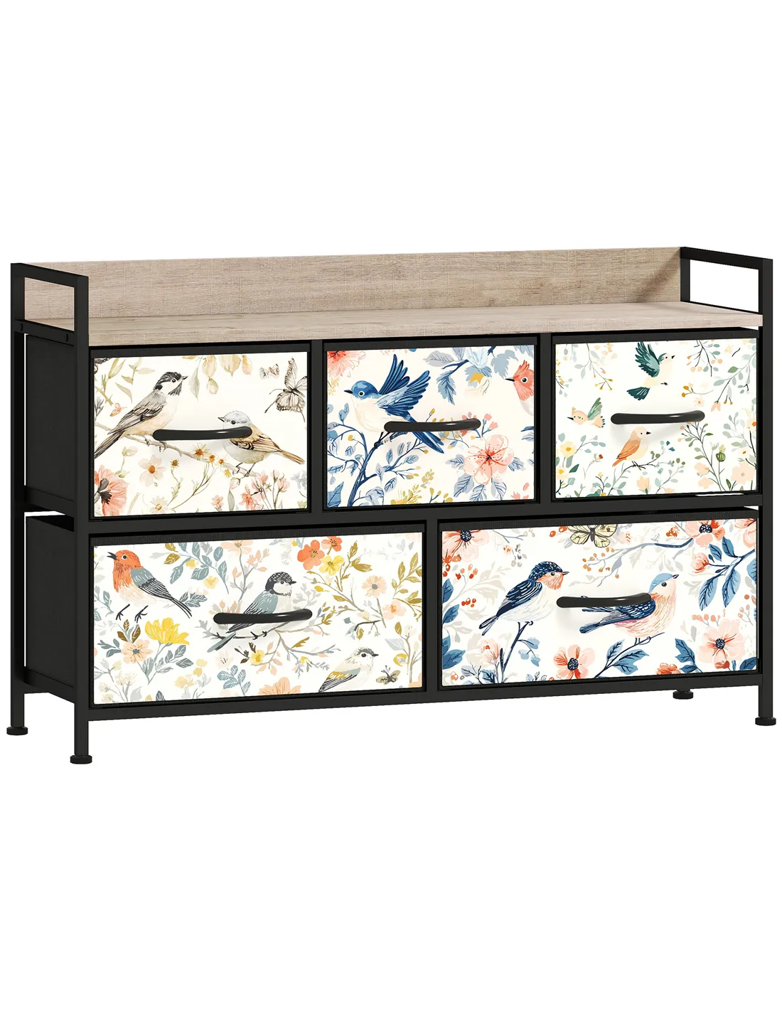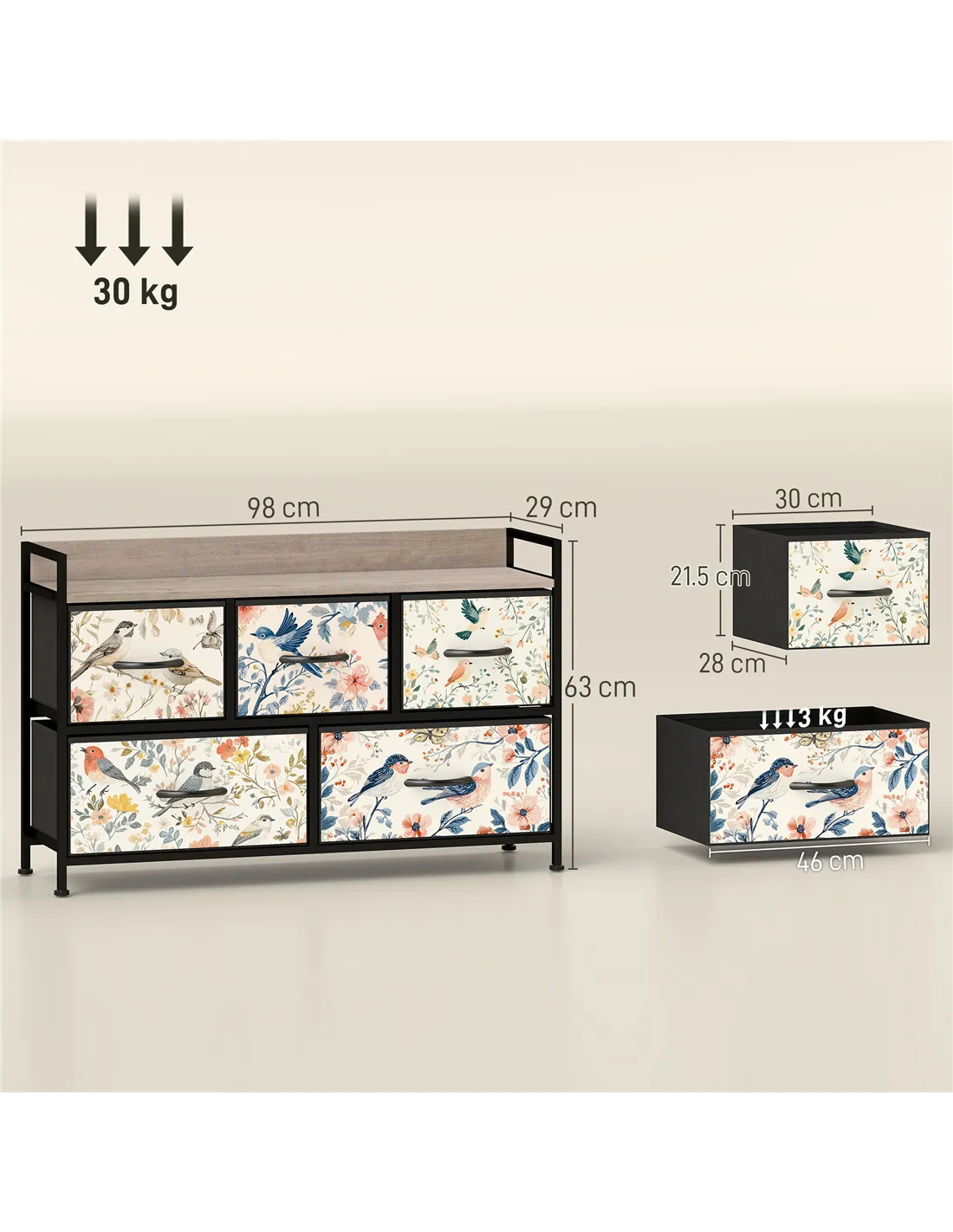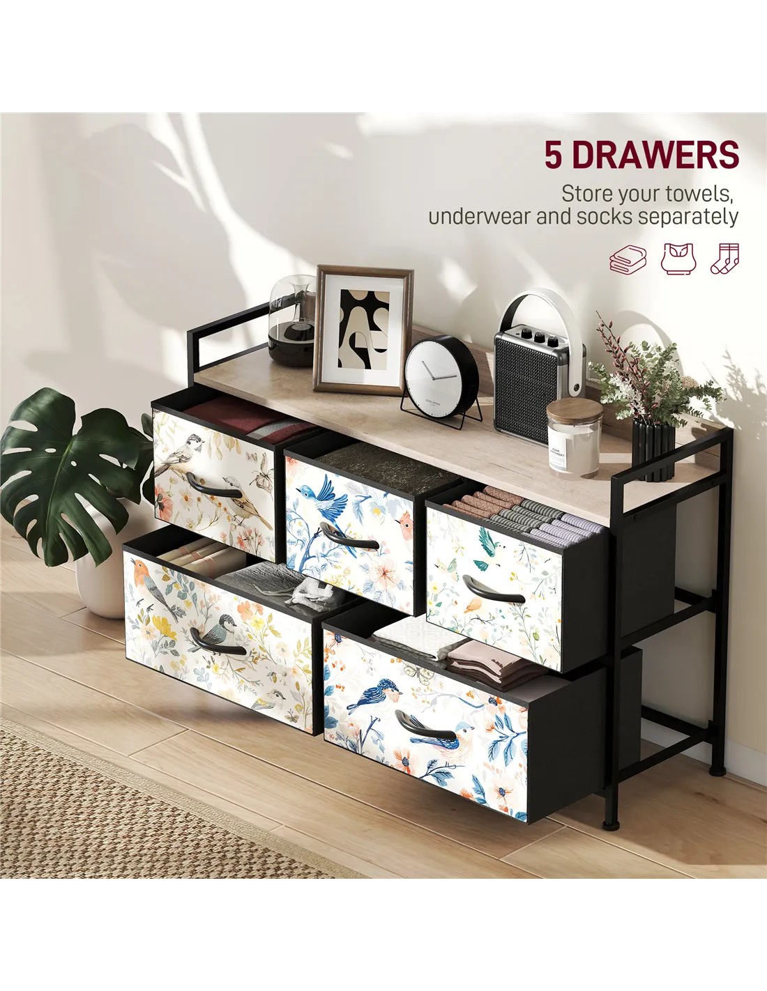 Transform your space with the HOMCOM chest of drawers, where style meets functionality! Adorned with exquisite patterns on each drawer panel, this bedroom drawers add a touch of elegance to any room. With five fabric drawers that are both removable and foldable, organising has never been easier. Great for bedrooms, living rooms, or home offices to keep your essentials tidy.