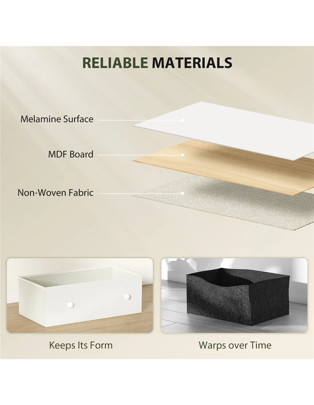 The HOMCOM chest of drawers with six fabric compartments is ideal for organising everyday clothing such as T-shirts, jeans, socks and accessories, making it a practical addition to any bedroom or dressing area. Its lightweight design and foldable drawers allow for flexible storage solutions in smaller rooms or shared spaces. The neutral white and grey finish complements modern and minimalist interiors, while the sturdy MDF and steel frame ensures durability for long-term use. This dresser can also serve as a stylish storage unit in a home office or hallway, helping to keep clutter at bay while enhancing your décor.