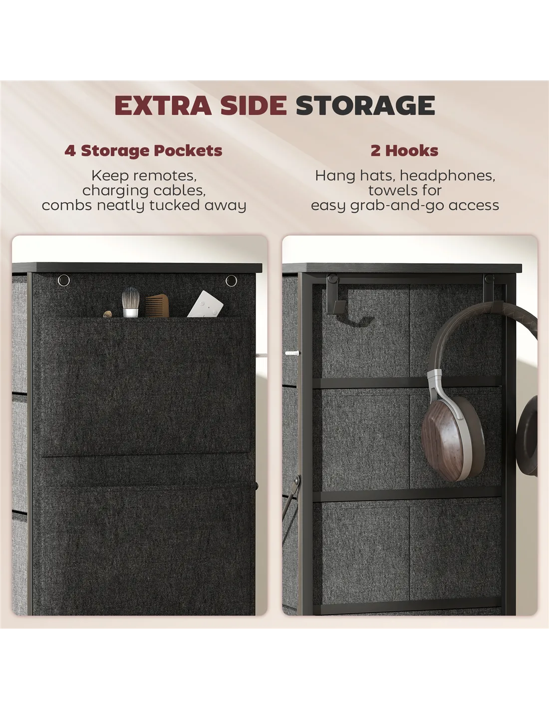 Easy, simple storage with this HOMCOM fabric chest of drawers. With six small and four large drawers, it's easy to sort everything from socks to pants. It also features four side pockets and two hooks to get smaller accessories altogether. A steel frame with X-bars keeps this bedroom dresser stable, finished with adjustable feet for balance - even on unsteady grounds.