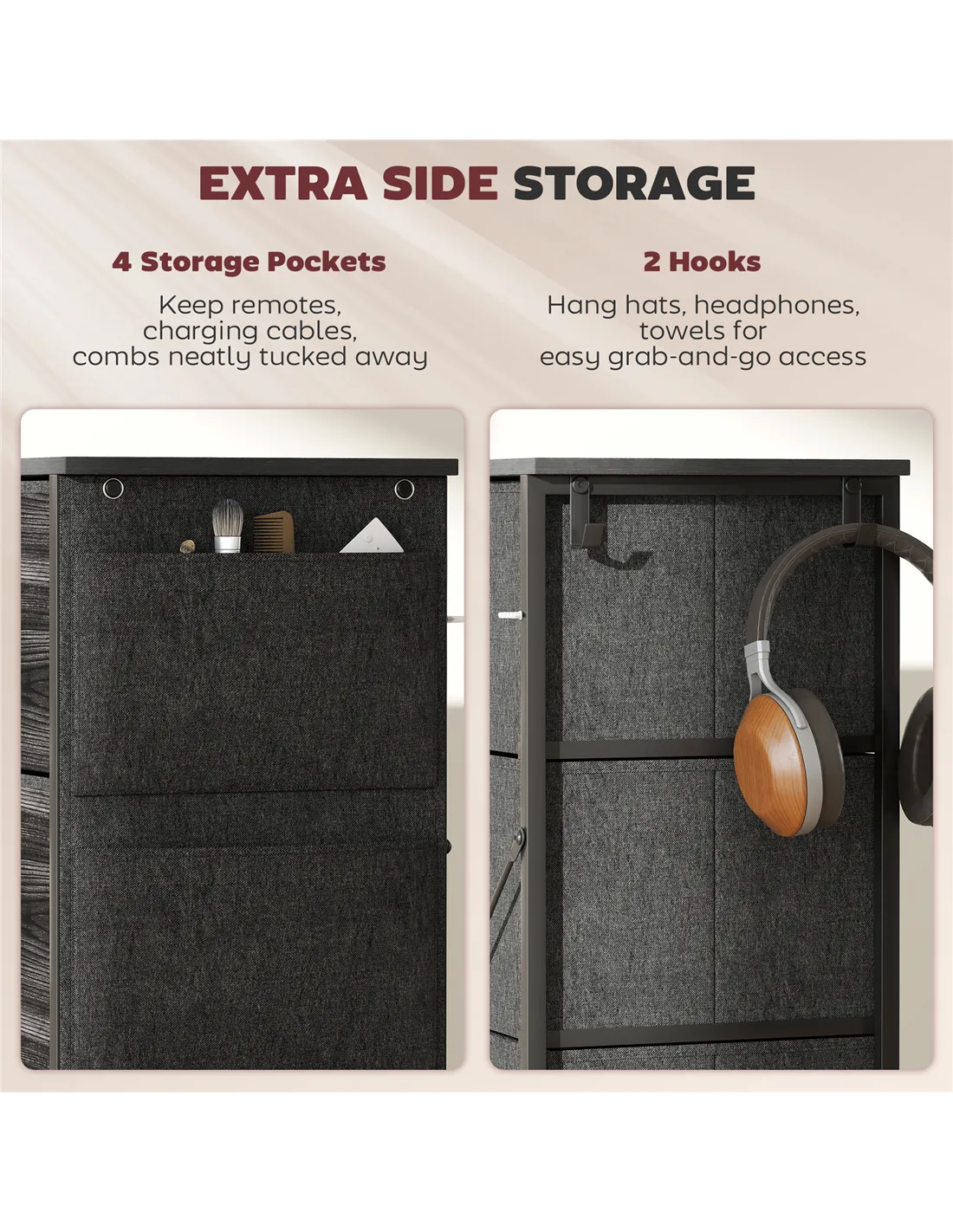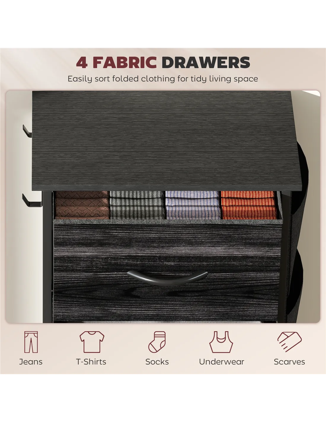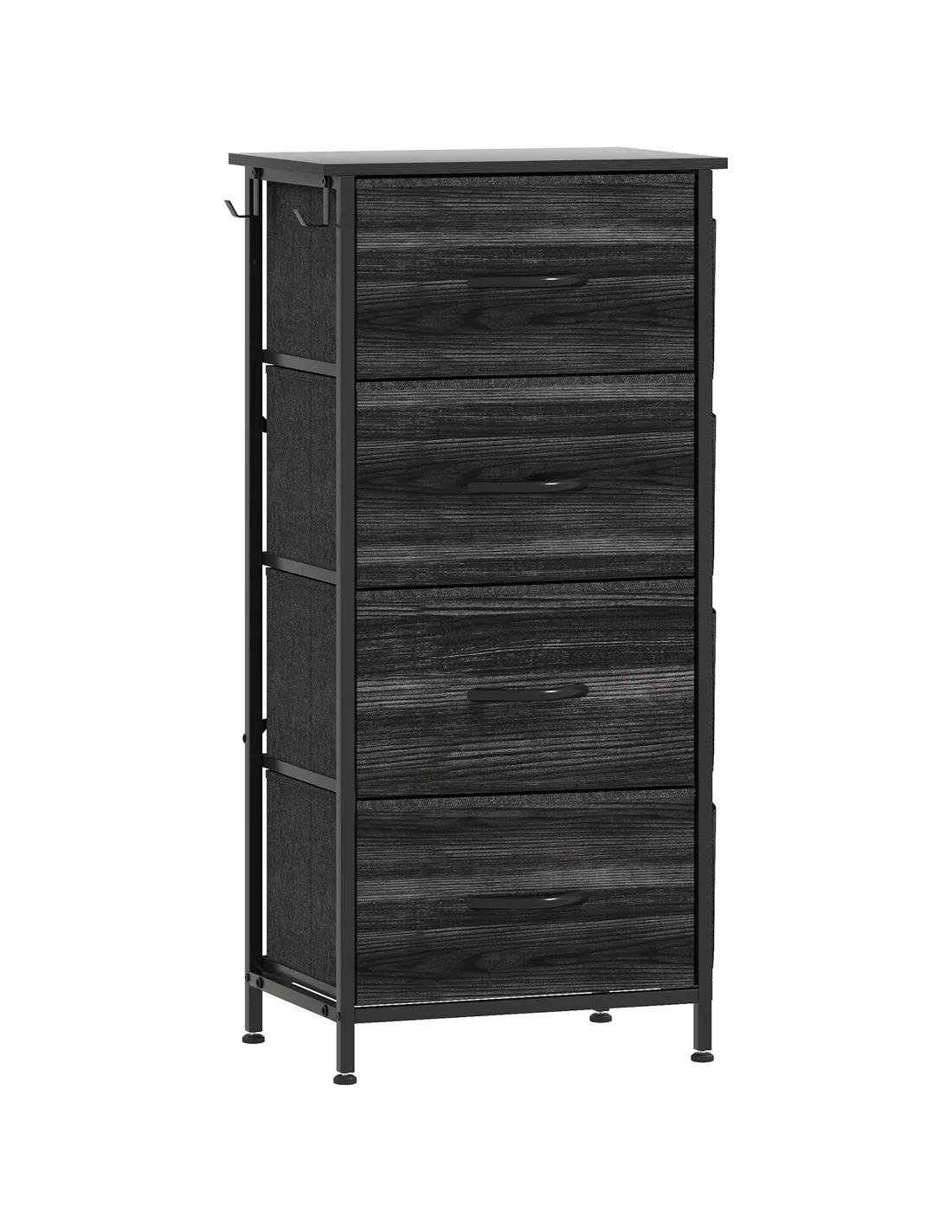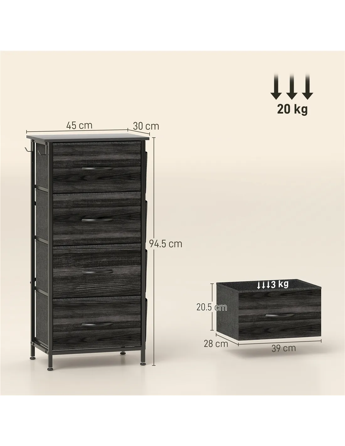 Easy, simple storage with this HOMCOM fabric chest of drawers. With four same drawers, it's easy to sort everything from socks to pants. It also features four side pockets and two hooks to get smaller accessories altogether. A steel frame with X-bars keeps this bedroom dresser stable, finished with adjustable feet for balance - even on unsteady grounds.