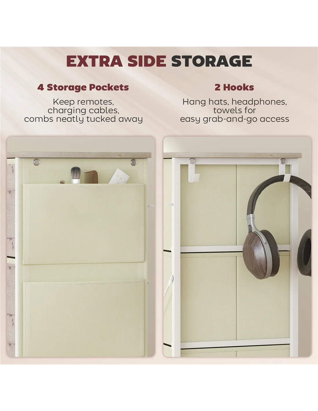Easy, simple storage with this HOMCOM fabric chest of drawers. With eight same drawers, it's easy to sort everything from socks to pants. It also features four side pockets and two hooks to get smaller accessories altogether. A steel frame with X-bars keeps this bedroom dresser stable, finished with adjustable feet for balance - even on unsteady grounds.