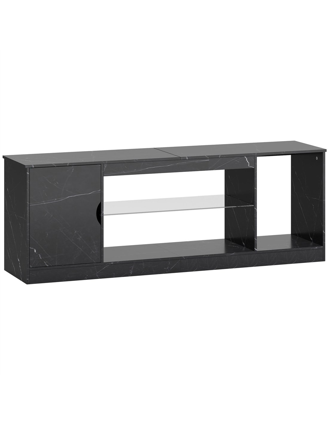 Elevate your living space with the HOMCOM TV stand, showcasing a chic black marble pattern designed for 45" and 55" TVs. This tv cabinet blends style with functionality, offering three open compartments and a hidden cabinet for all your gadgets. Crafted from particle board with a melamine coat, it promises lasting stability and is a breeze to maintain.