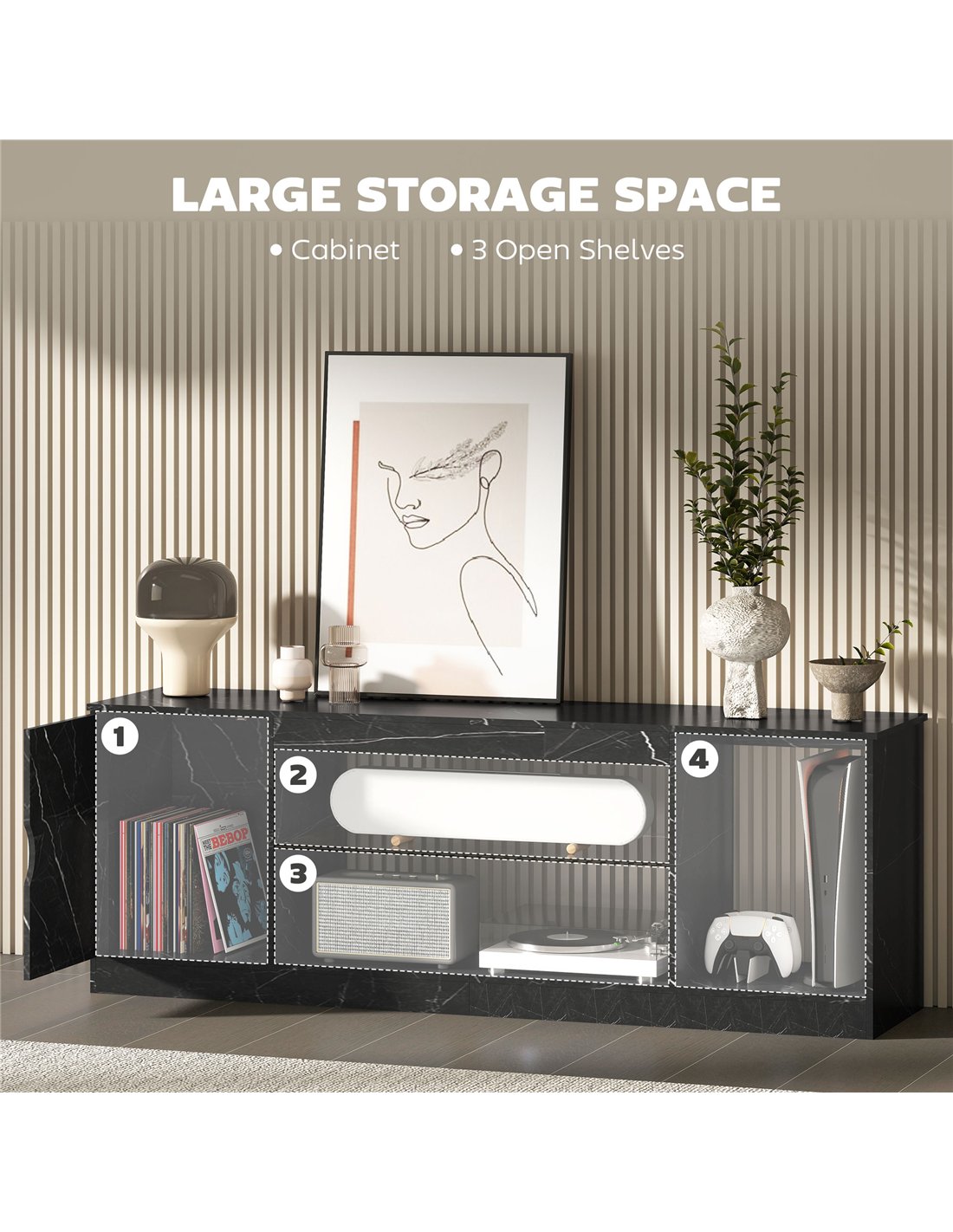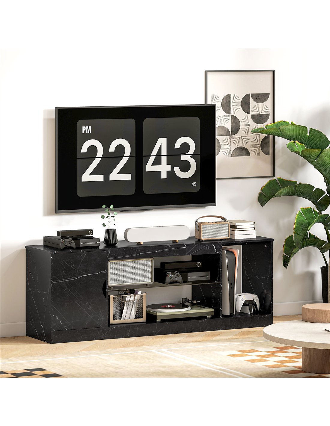 - Black marble pattern suits modern decor, fits 45" and 55" TVs