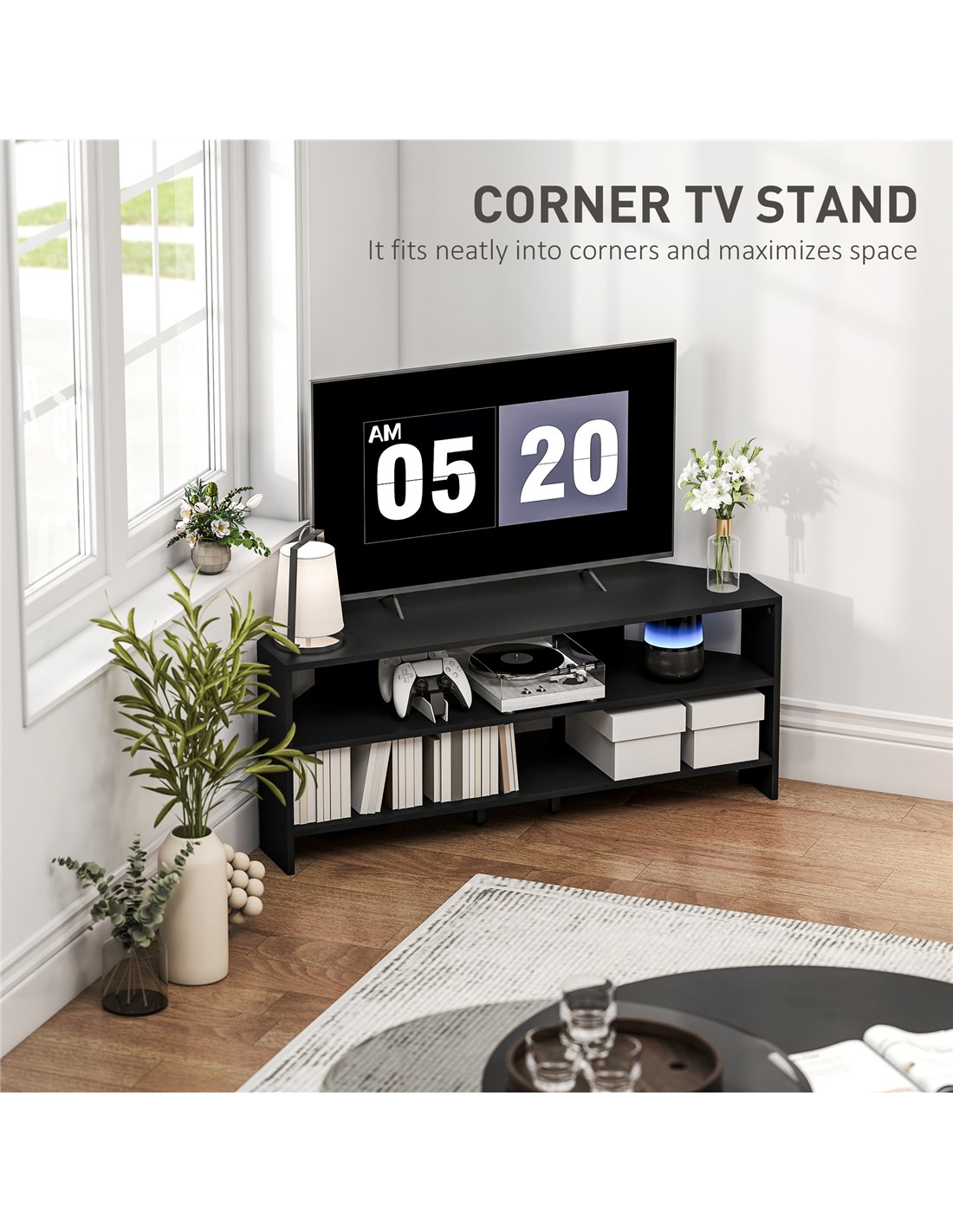 - Corner design TV stand maximizes room space