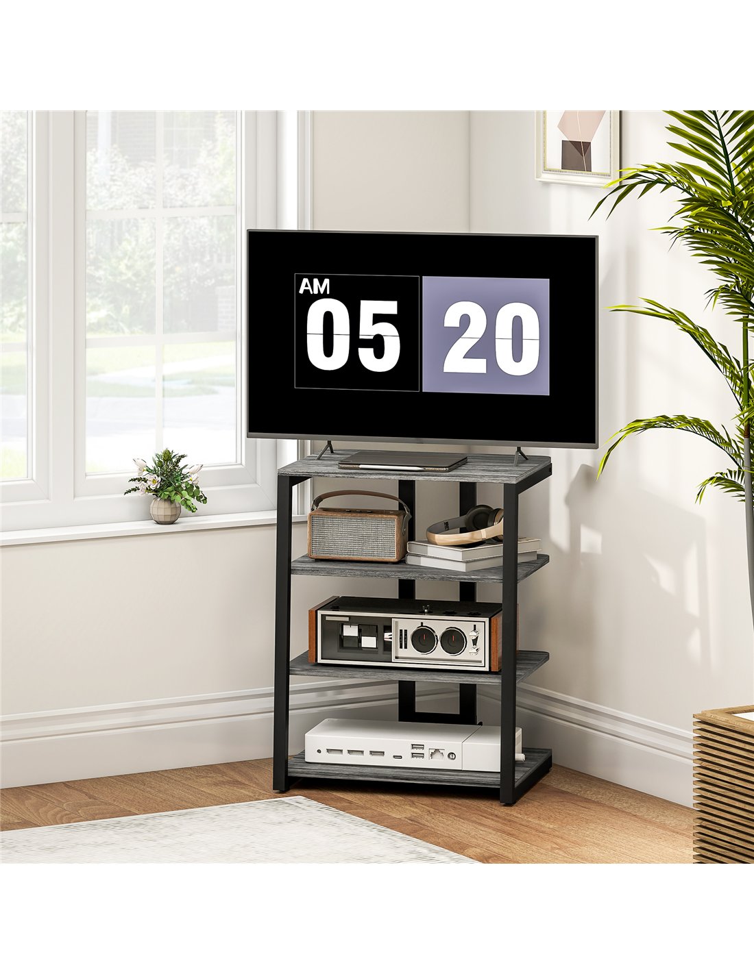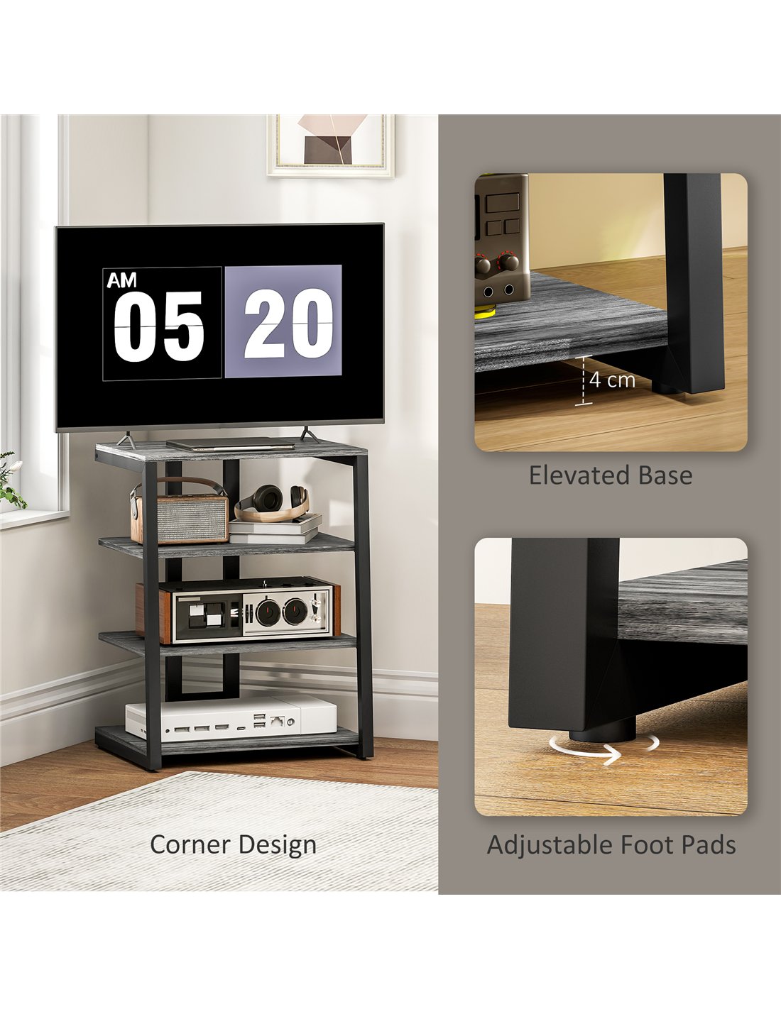 - 4-tier shelf provide handy room for media items. Two are two-level adjustable