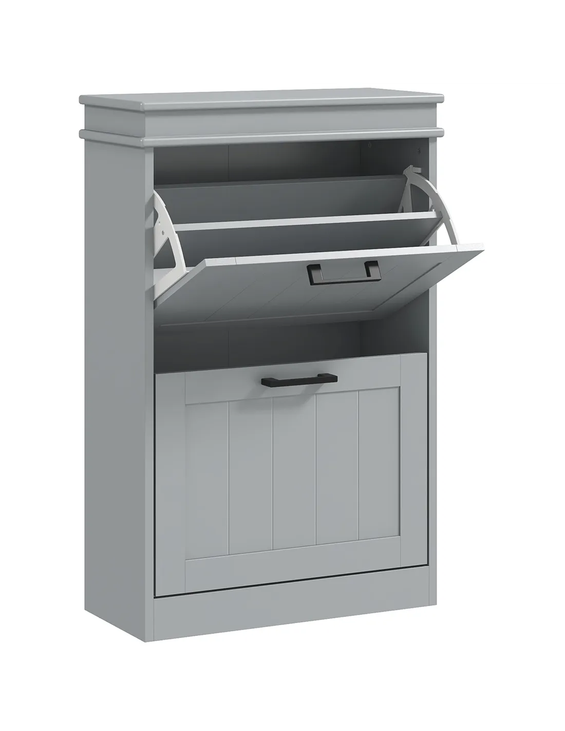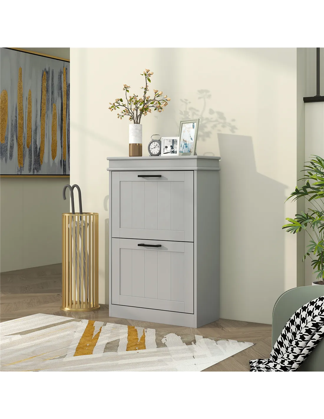 The HOMCOM two-drawer shoe cabinet is ideal for optimising hallway or entrance spaces, especially in compact homes or flats across the UK. Its slim profile fits neatly into narrow corridors, providing organised storage for up to 10 pairs of shoes, including boots, trainers, and formal footwear. Thanks to the adjustable inner shelves, it accommodates various shoe heights, making it perfect for families with diverse footwear needs. The neutral grey finish complements modern and minimalist interiors, blending effortlessly with existing décor. Secure the cabinet to the wall using the included anti-tipping straps for added safety, particularly in homes with children or pets. This versatile unit can also serve as a small storage solution in bedrooms or dressing areas, keeping footwear tidy and accessible.
