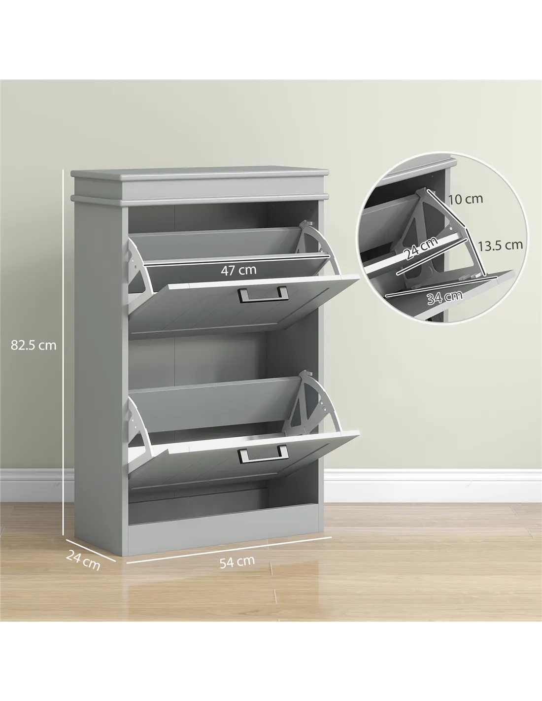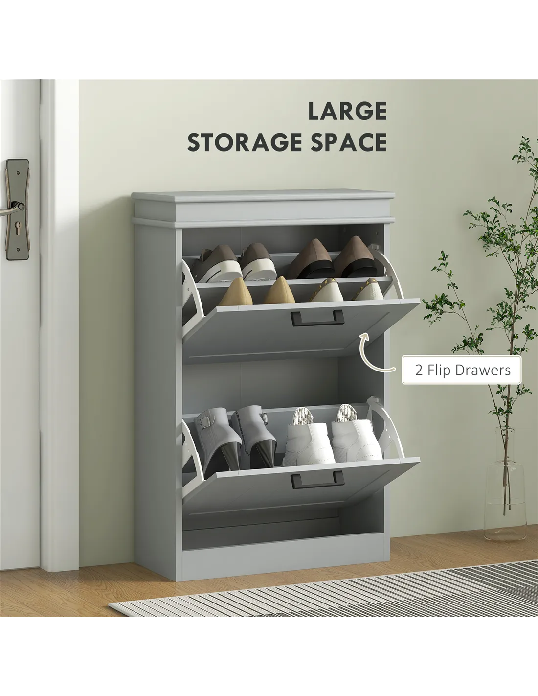 For even the smallest of spaces, welcome in this HOMCOM narrow shoe cabinet. With two flip drawers, it offers space for up to 10 shoe pairs. Each drawer comes with a two-level adjustable shelf to cater for different shoe sizes and types. Made from MDF this is a robust piece suitable for everyday use; this minimalistic grey shoe cabinet comes with anti-tipping straps to securely attach to a wall.