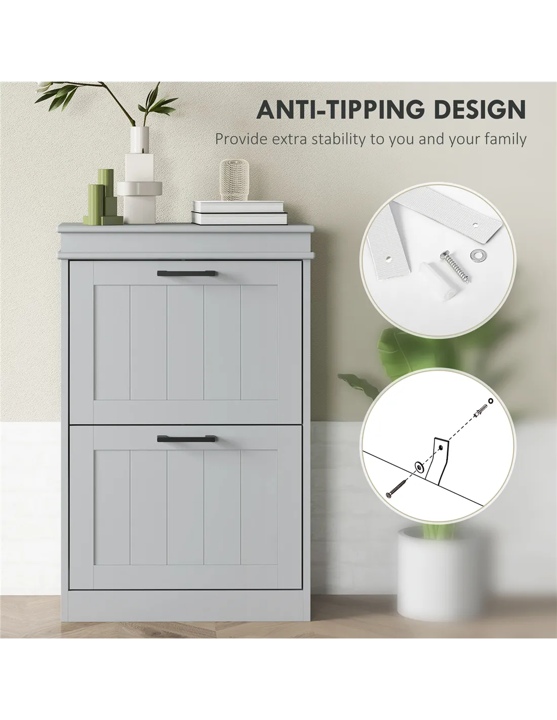 - Anti-tipping straps included with shoe storage cabinet for safety
