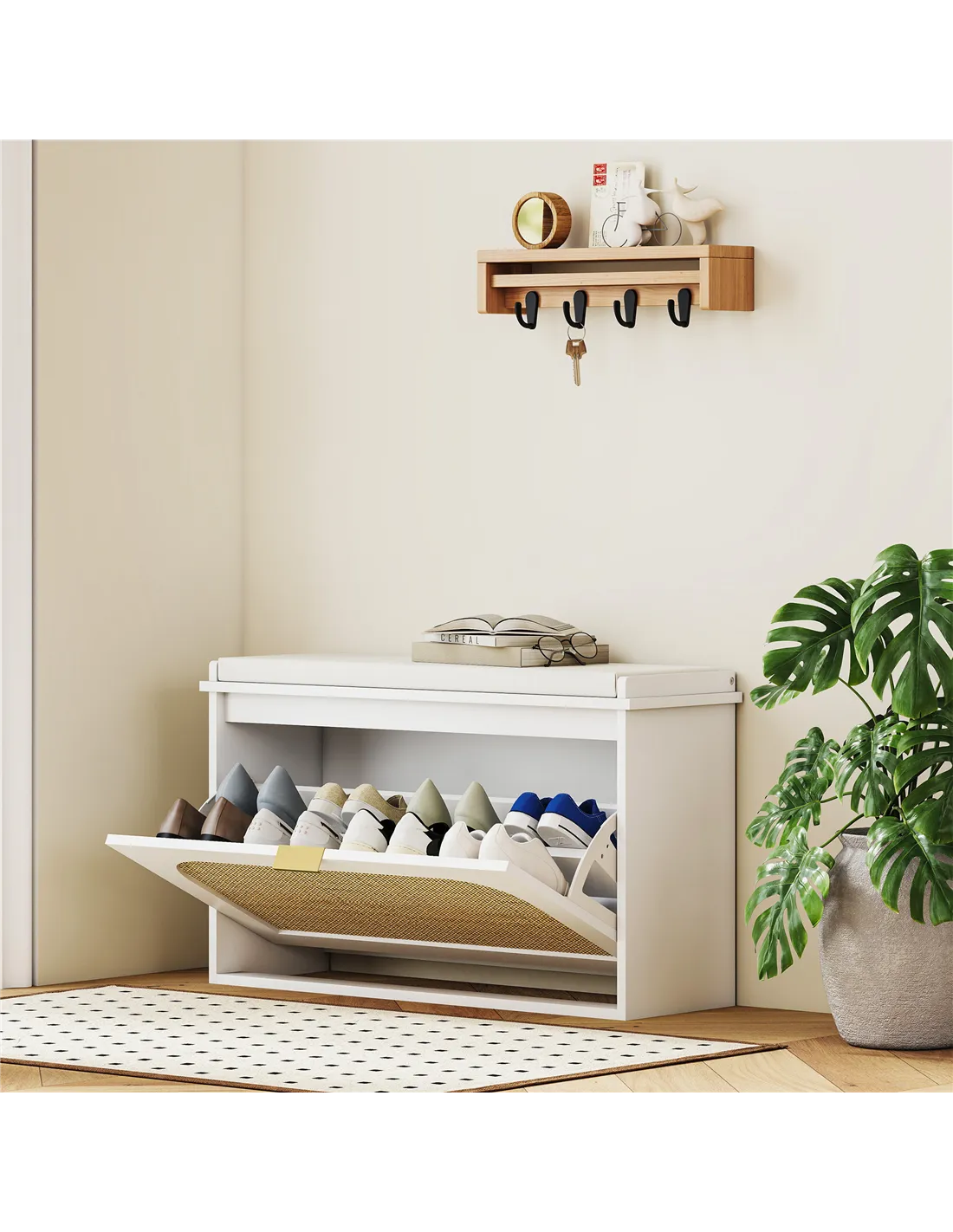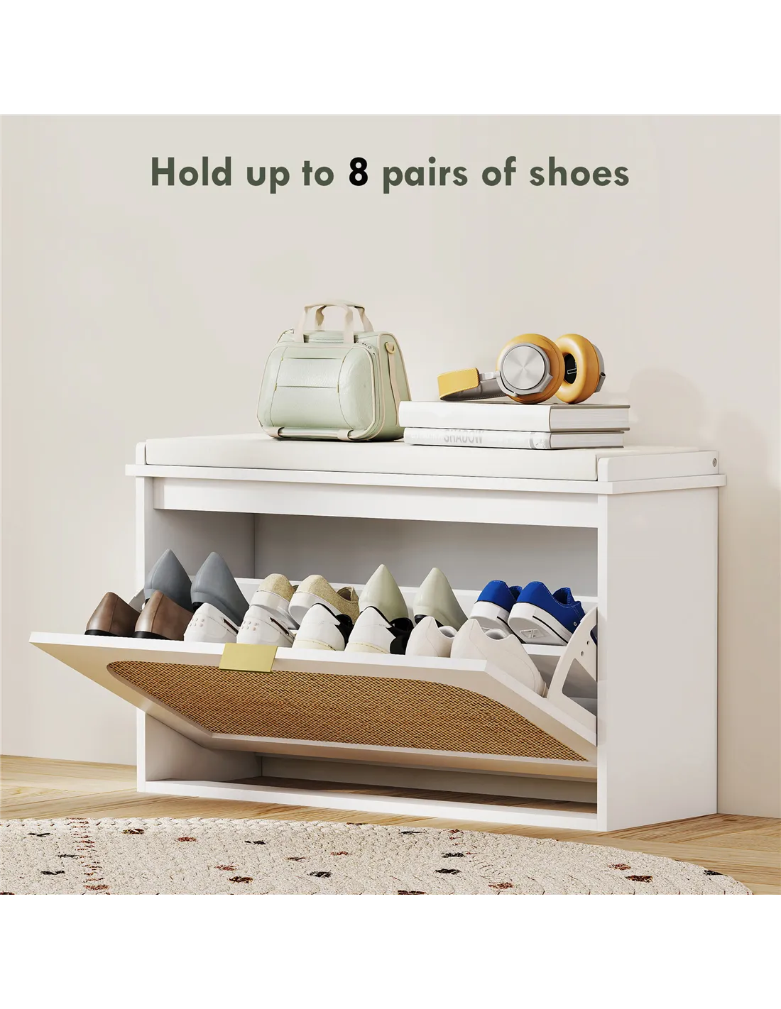 - A flip drawer holds up to eight pairs of shoes neatly