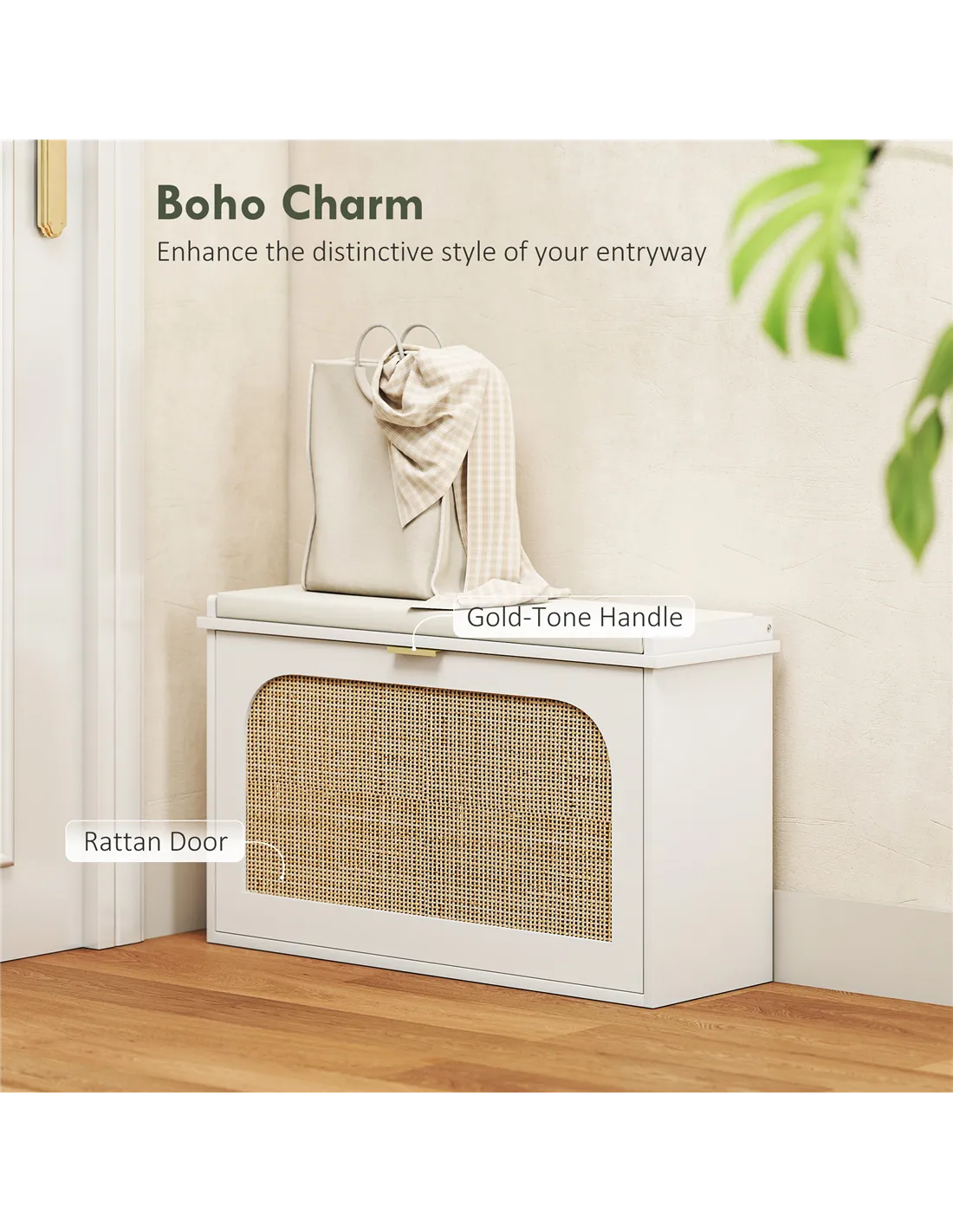 Step into a serene entryway with the HOMCOM shoe storage bench. Tired of clutter? The flip door and double shelf design offer effortless organization, keeping your shoes neatly arranged. Imagine the comfort of a thick cushion as you change shoes, with a breathable linen-feel fabric surface ensuring cleanliness. The rattan door adds a boho touch, enhancing your home's inviting atmosphere.