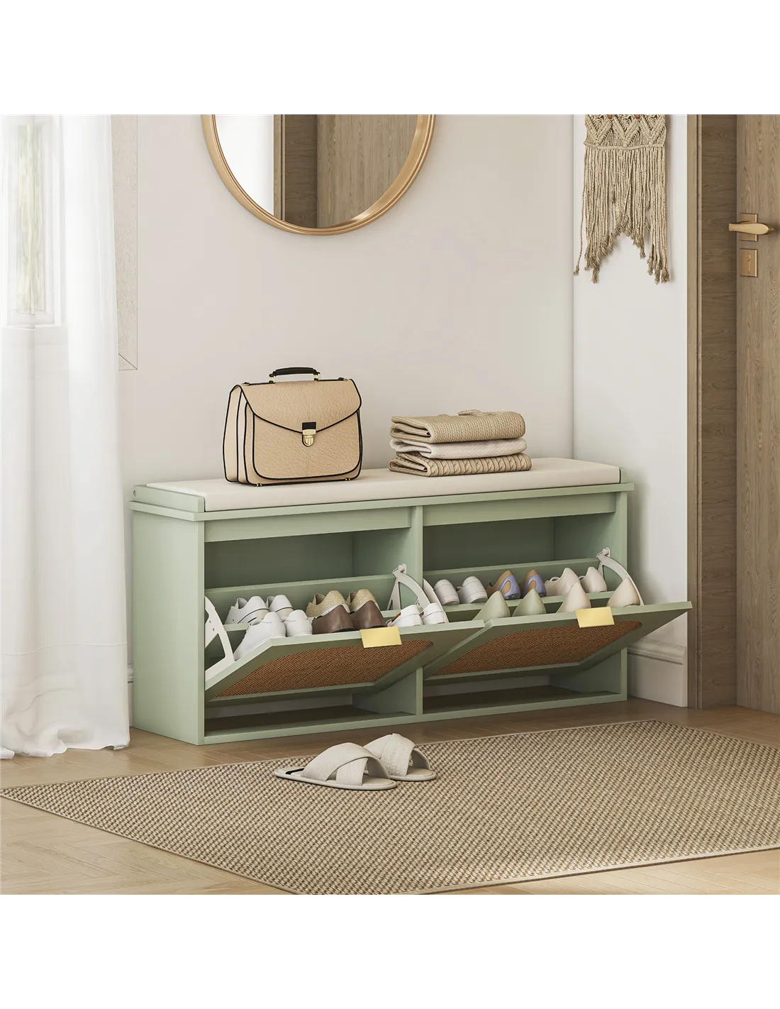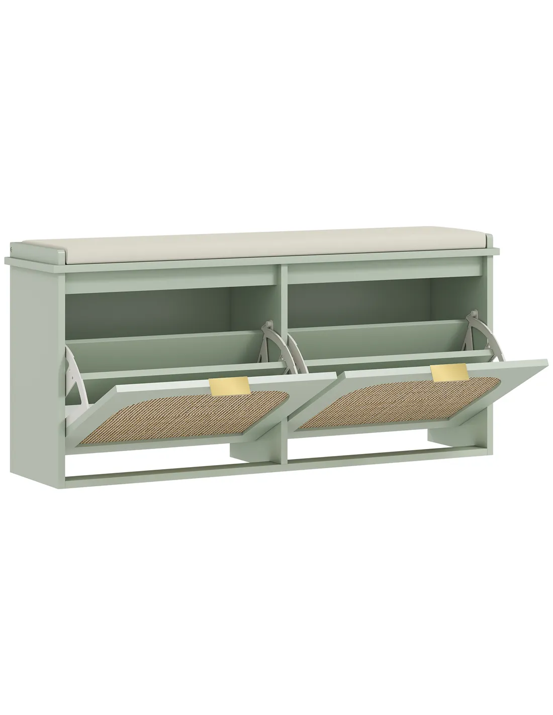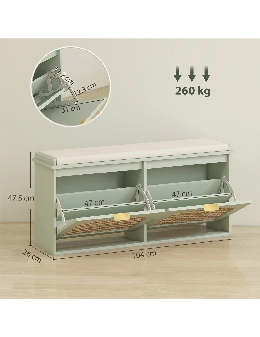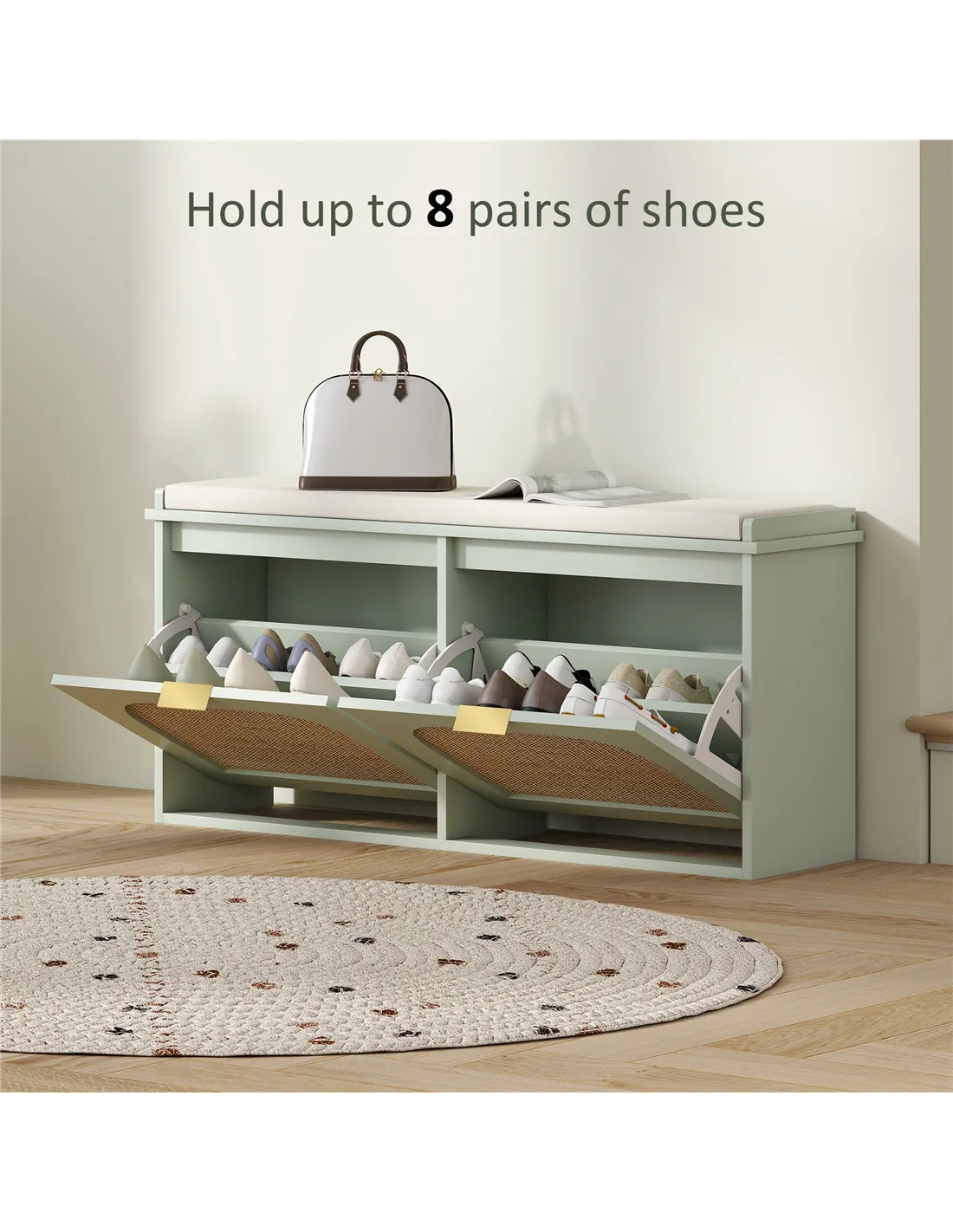 HOMCOM Boho Shoe Bench with Padded Seat and 2 Flip-Drawers - Light Green