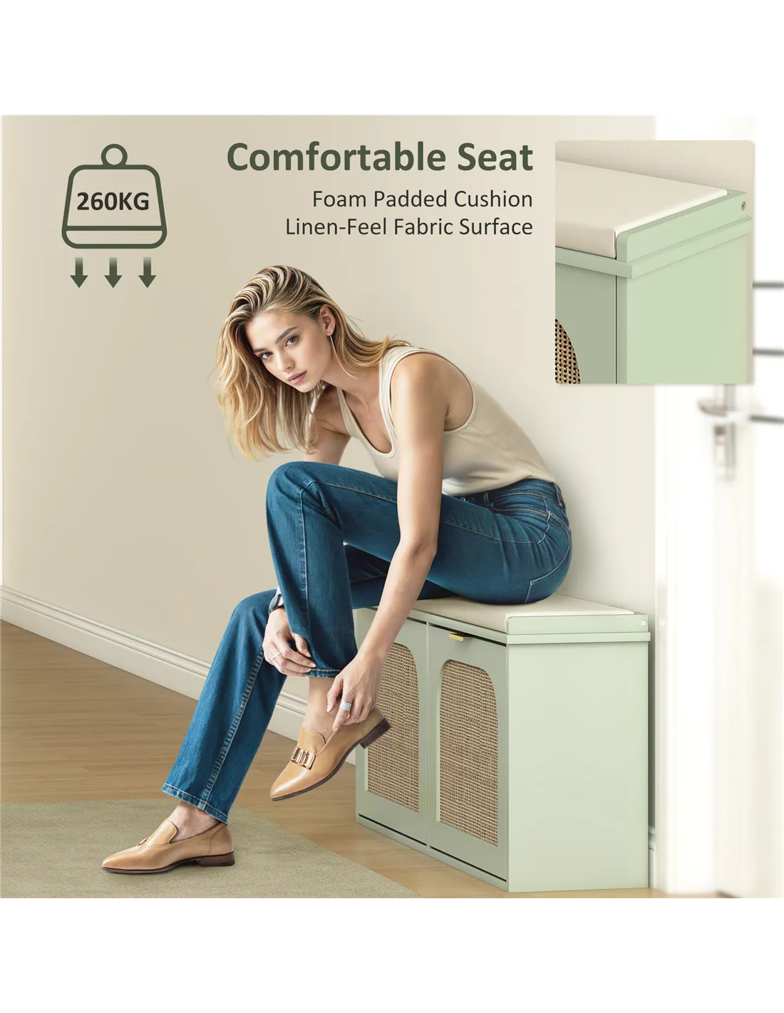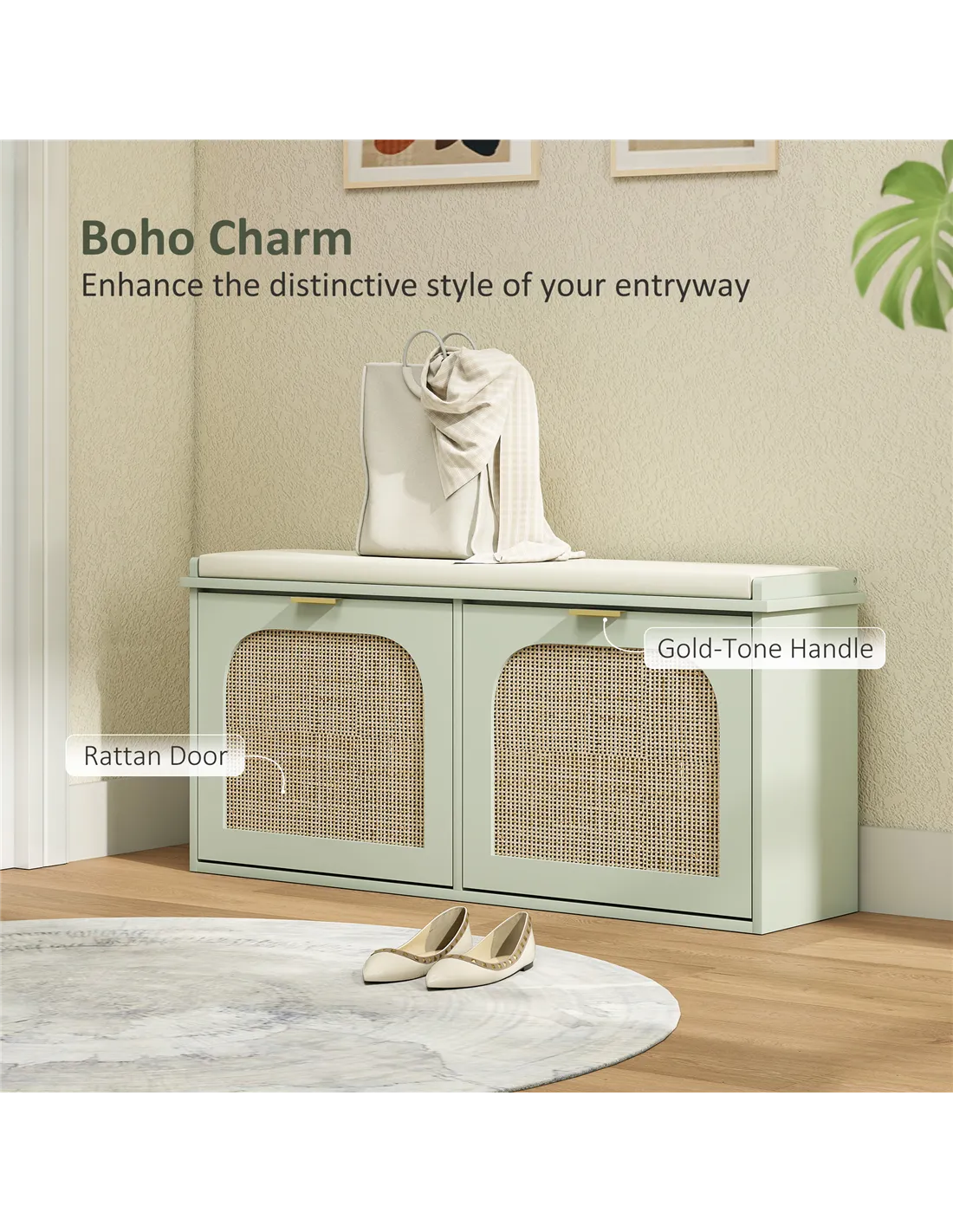 Step into a serene entryway with the HOMCOM shoe storage bench. Tired of clutter? The flip doors and double shelf design offer effortless organization, keeping your shoes neatly arranged. Imagine the comfort of a thick cushion as you change shoes, with a breathable linen-feel fabric surface ensuring cleanliness. The rattan doors add a boho touch, enhancing your home's inviting atmosphere.
