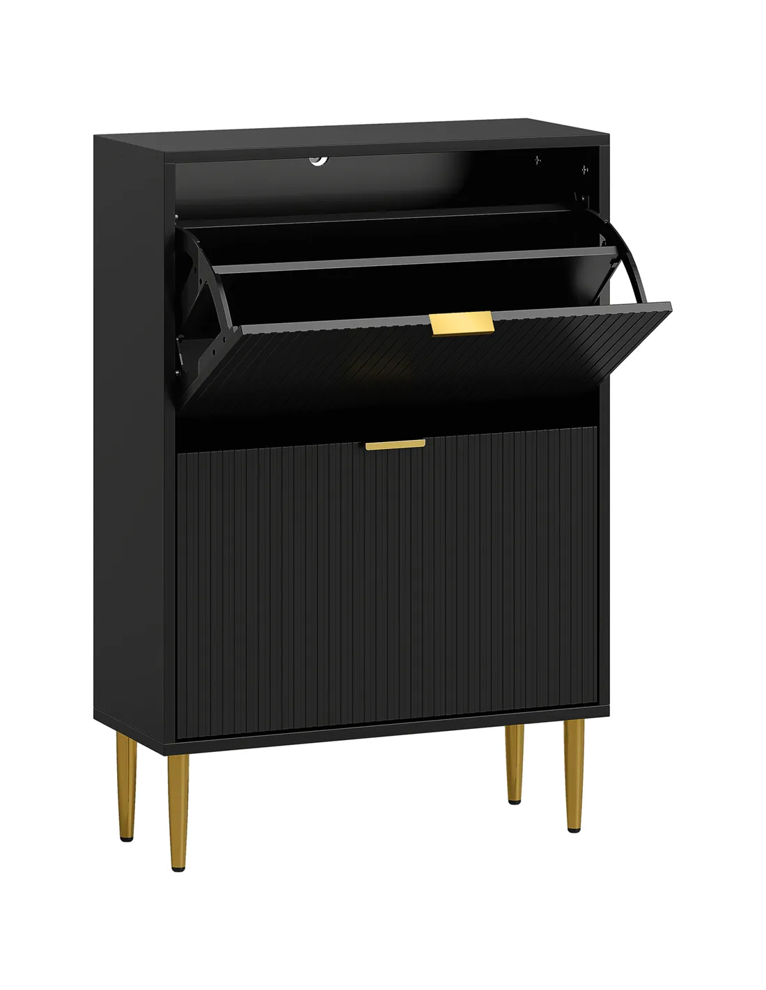 - Its elegant black finish with fluted panels and gold-tone handles complements modern and classic interiors alike, adding a touch of sophistication to your home.
