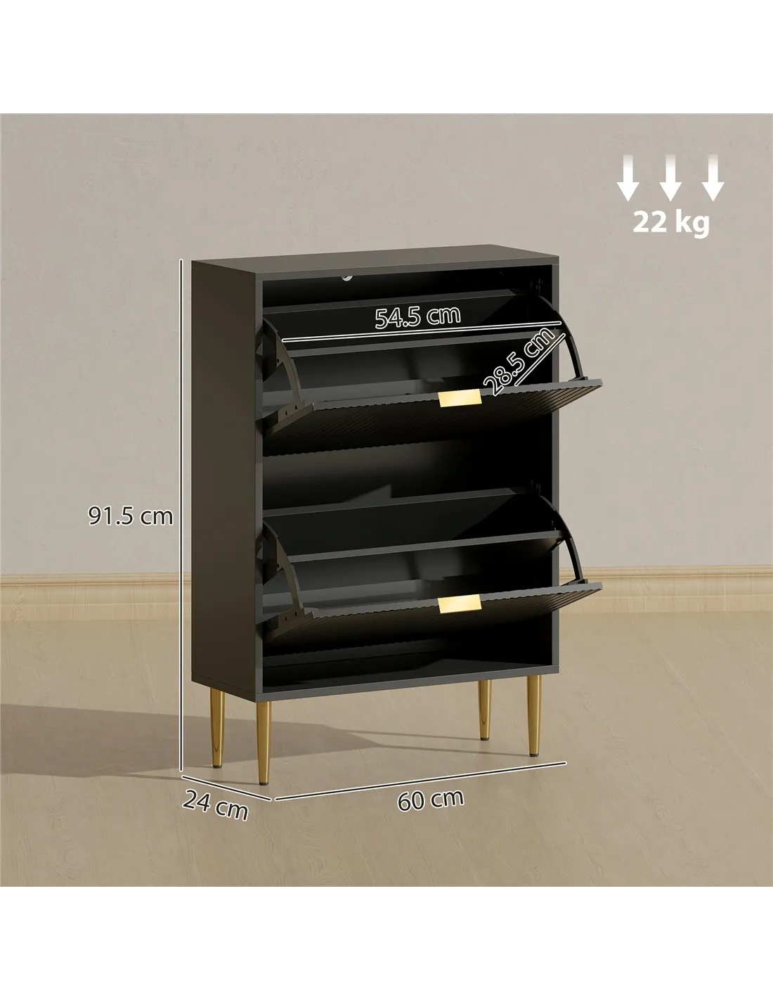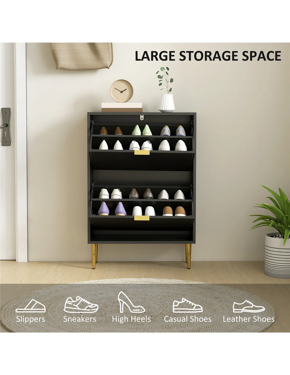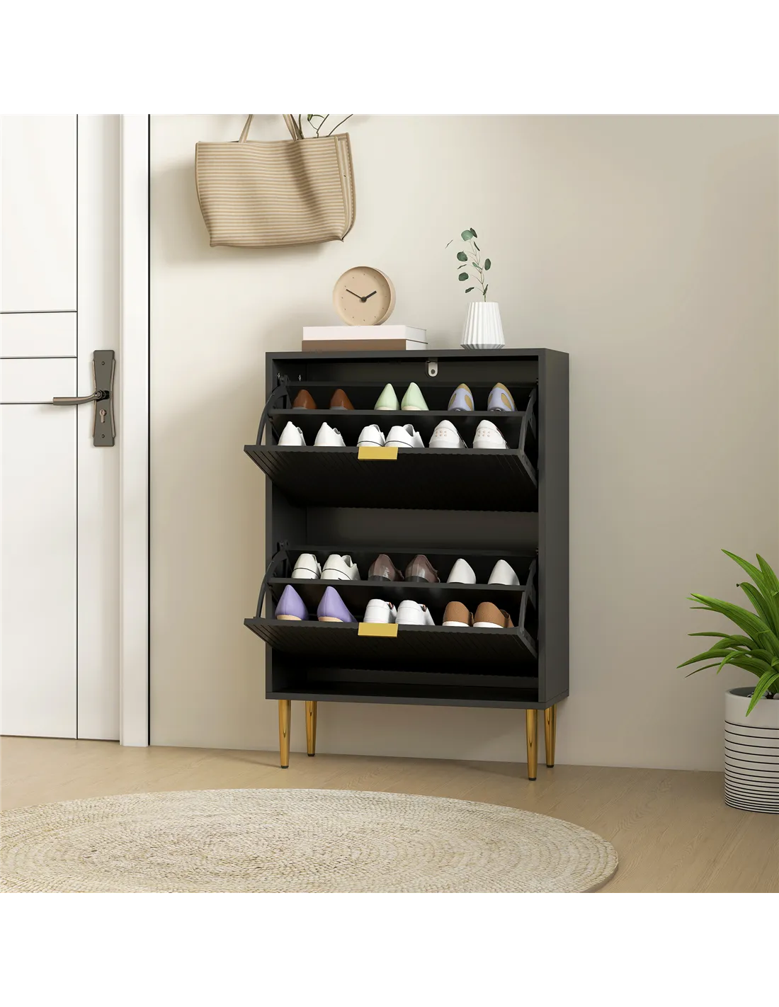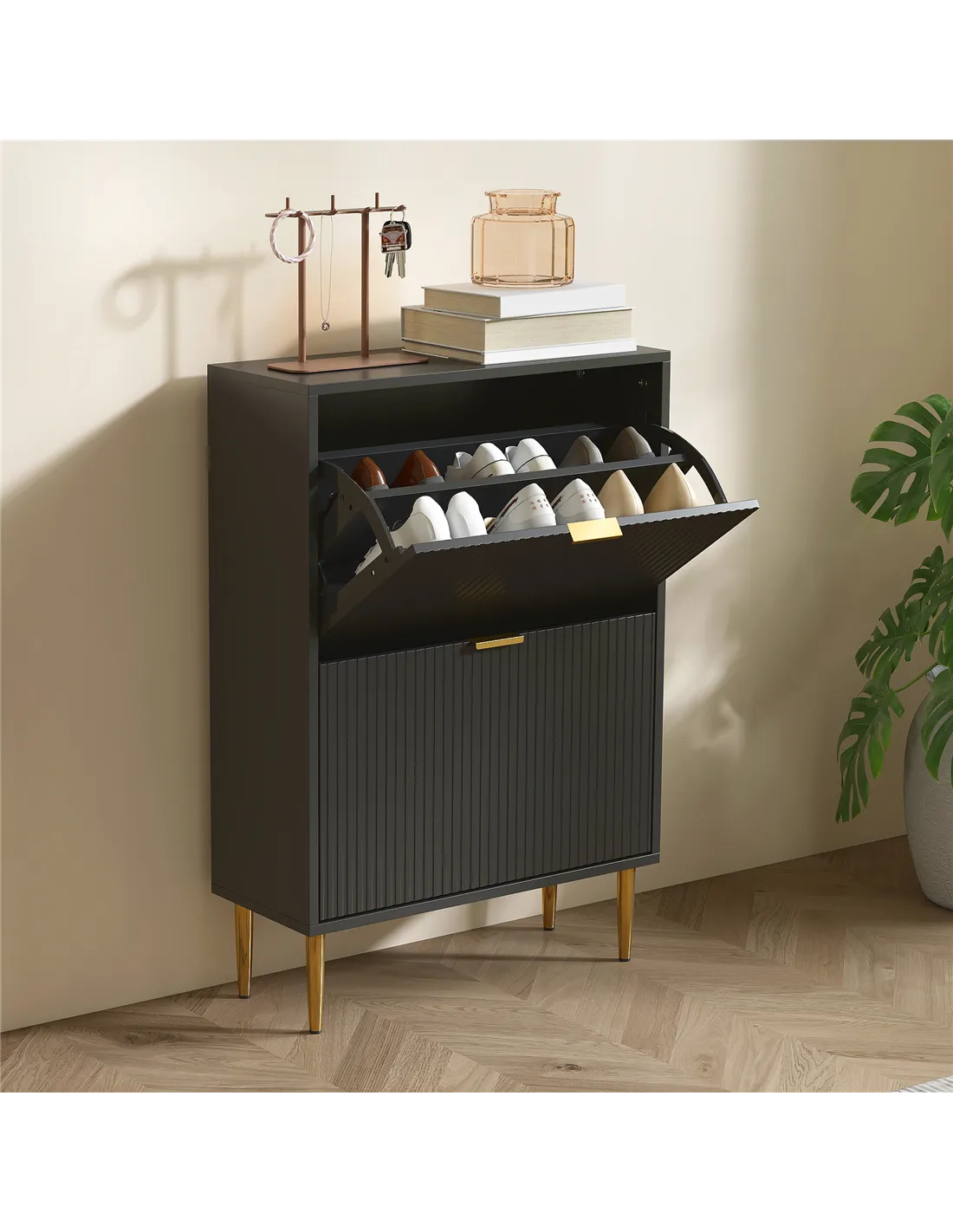 - Two flip drawers can store up to 12 pairs of shoes