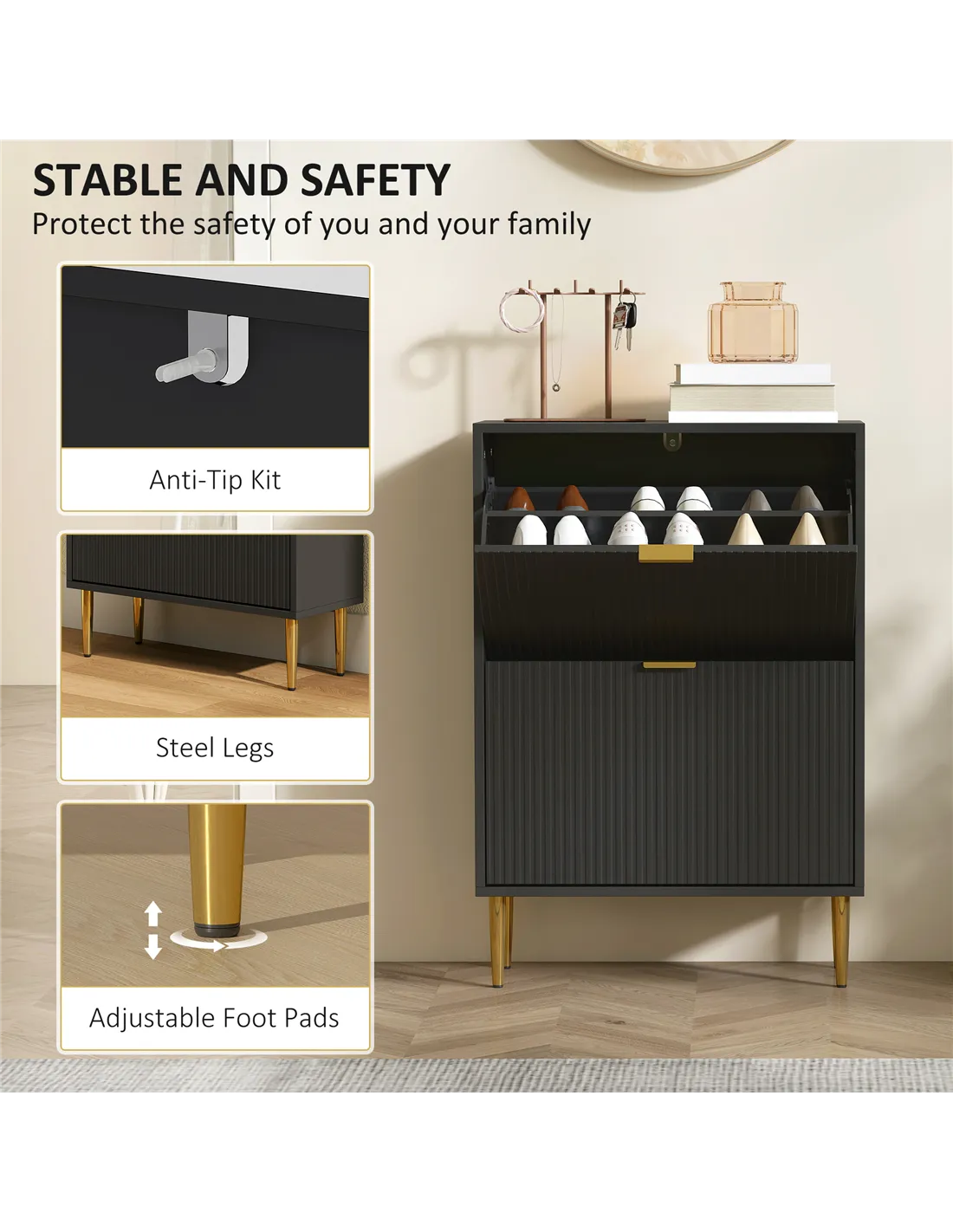 A: Yes, the shoe cabinet includes an anti-tip kit and adjustable foot pads to enhance stability and safety in family environments.
