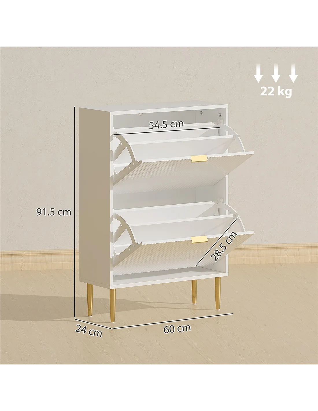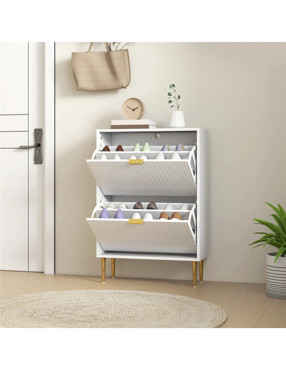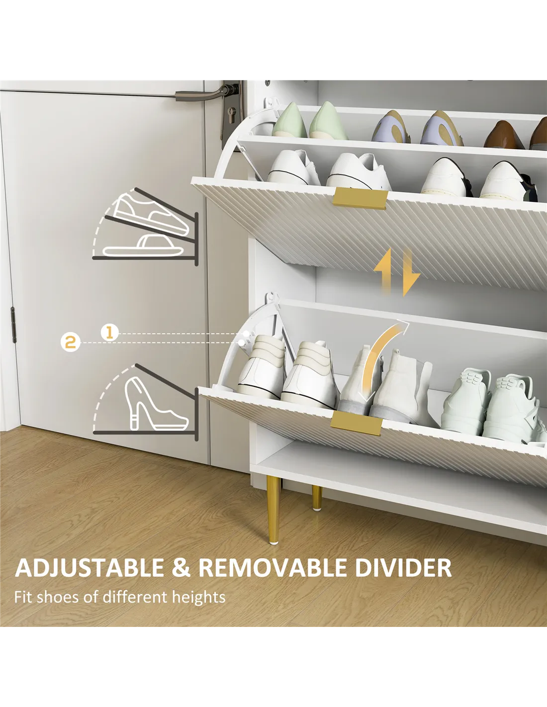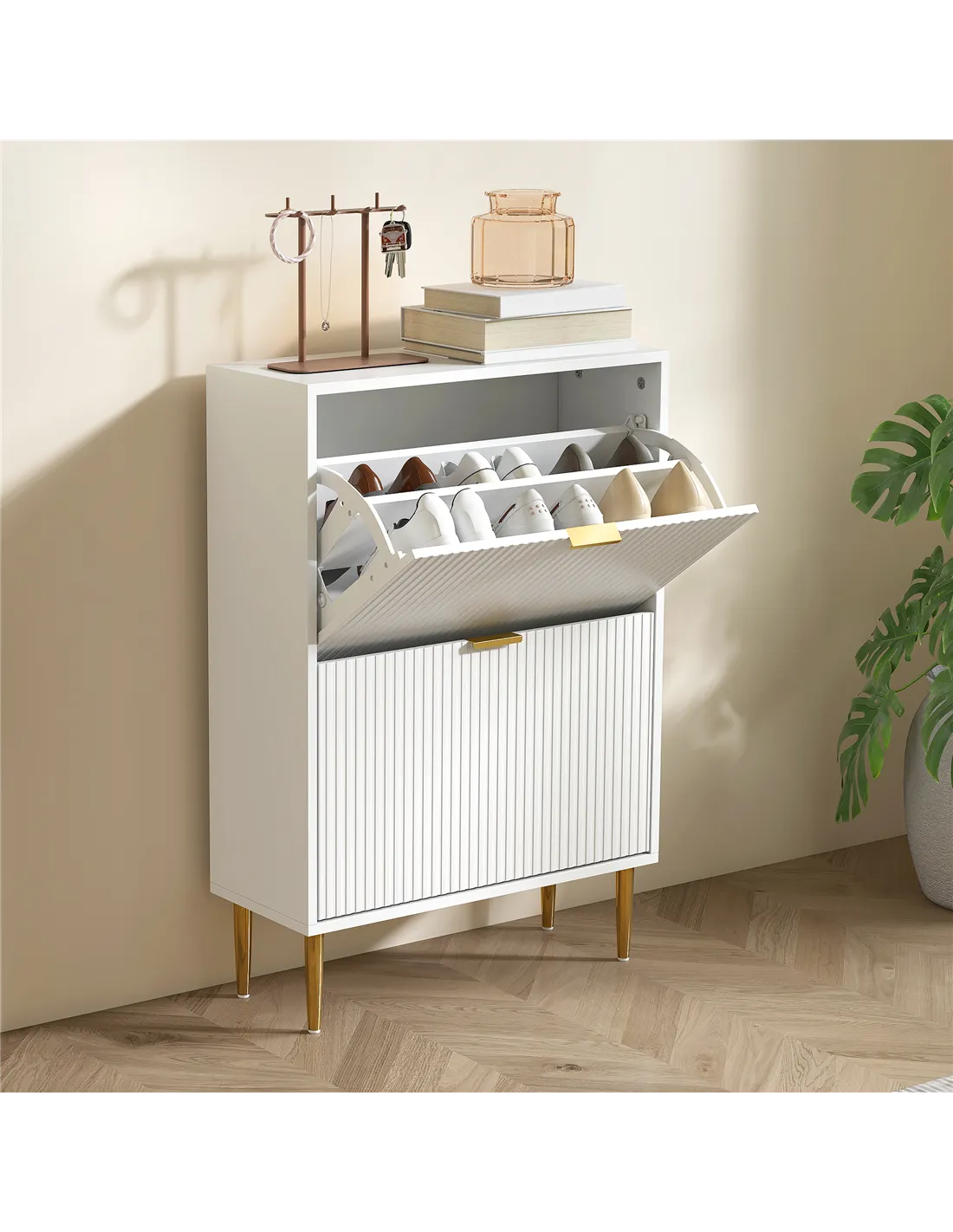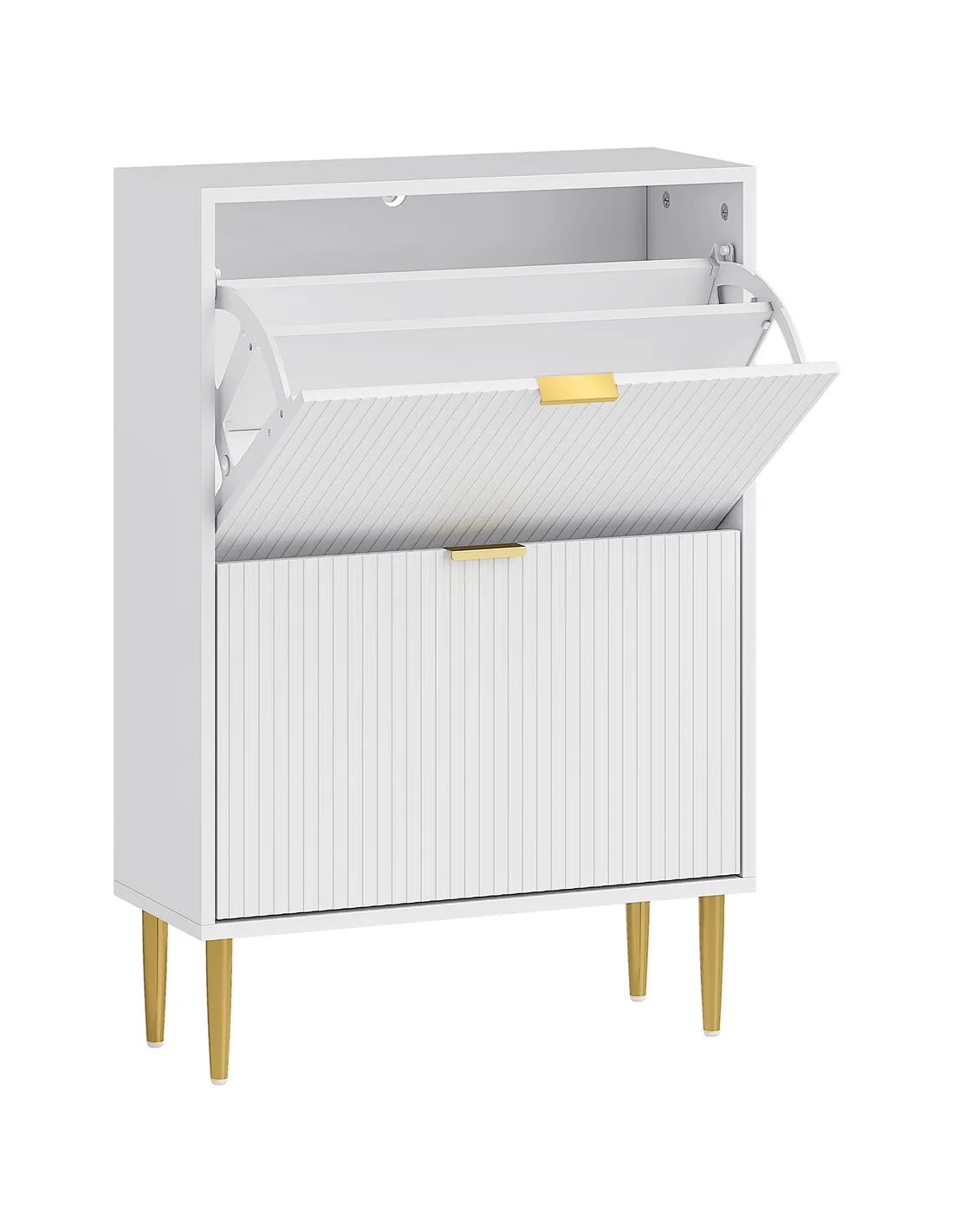 The HOMCOM narrow shoe cabinet with two flip drawers is an ideal addition to any hallway or entrance, helping to maintain a neat and welcoming space. Its slim profile fits perfectly in compact areas, making it suitable for flats, terraced houses, or cottages across the UK. Use the adjustable shelves to store a variety of footwear, from trainers and heels to ankle boots, keeping them organised and easily accessible. The elegant white finish with fluted panels and gold-tone handles complements modern and classic interiors alike. Place it near your front door for quick shoe storage or in a bedroom or dressing room to keep your footwear collection tidy and protected.