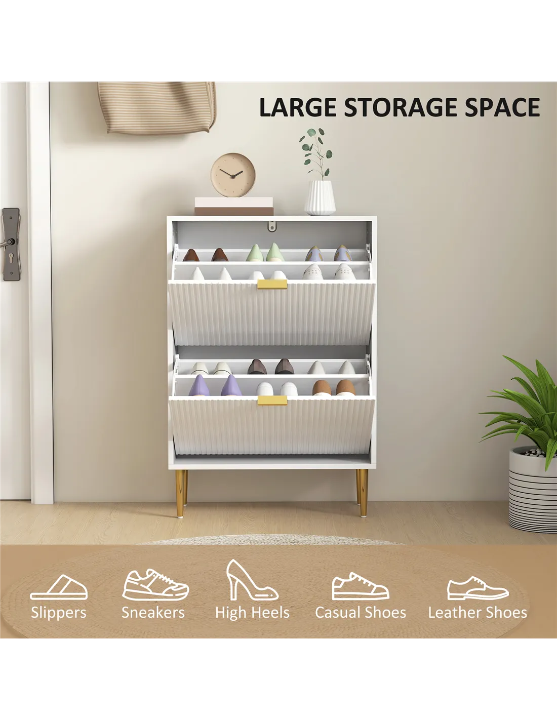 - Two flip drawers can store up to 12 pairs of shoes