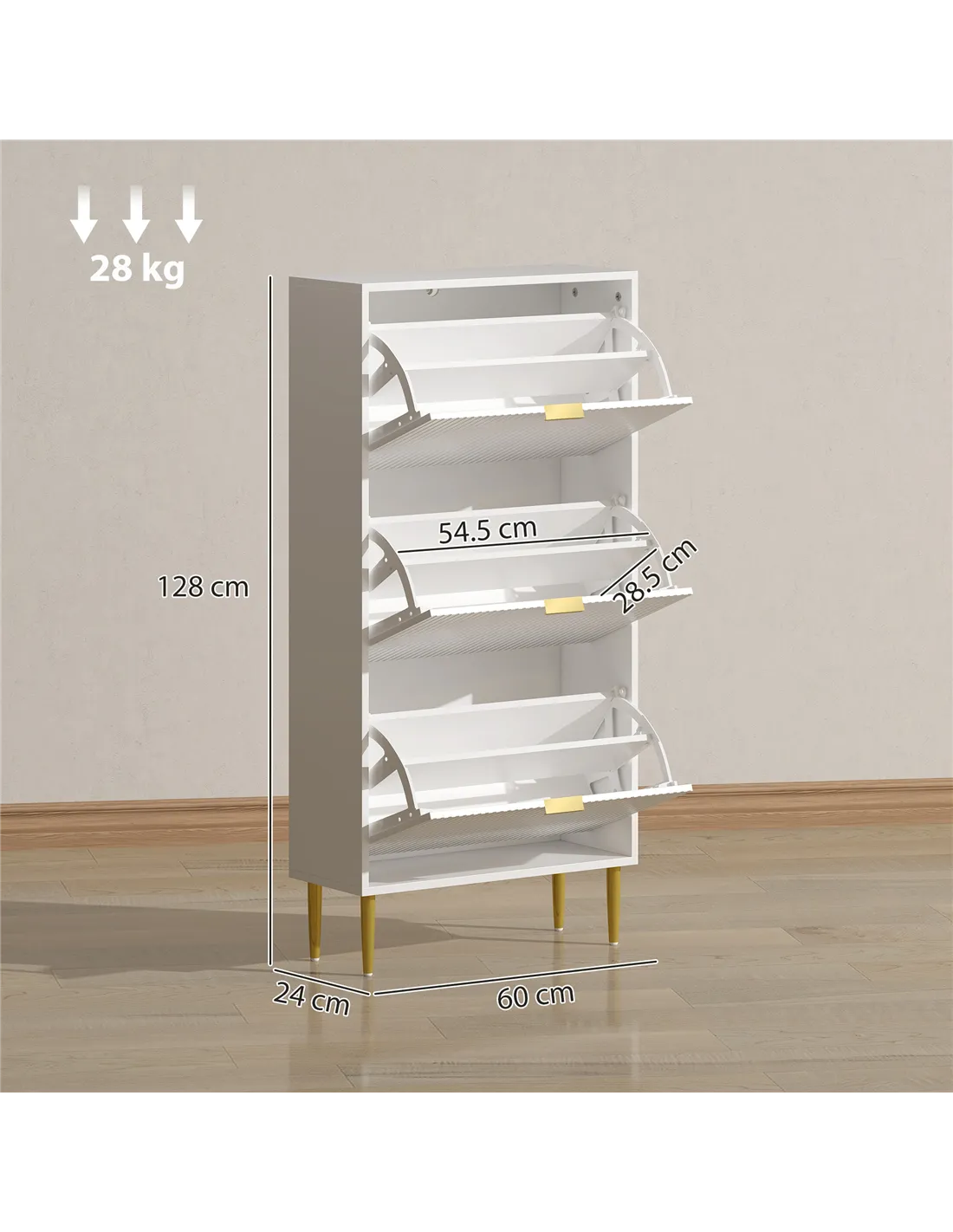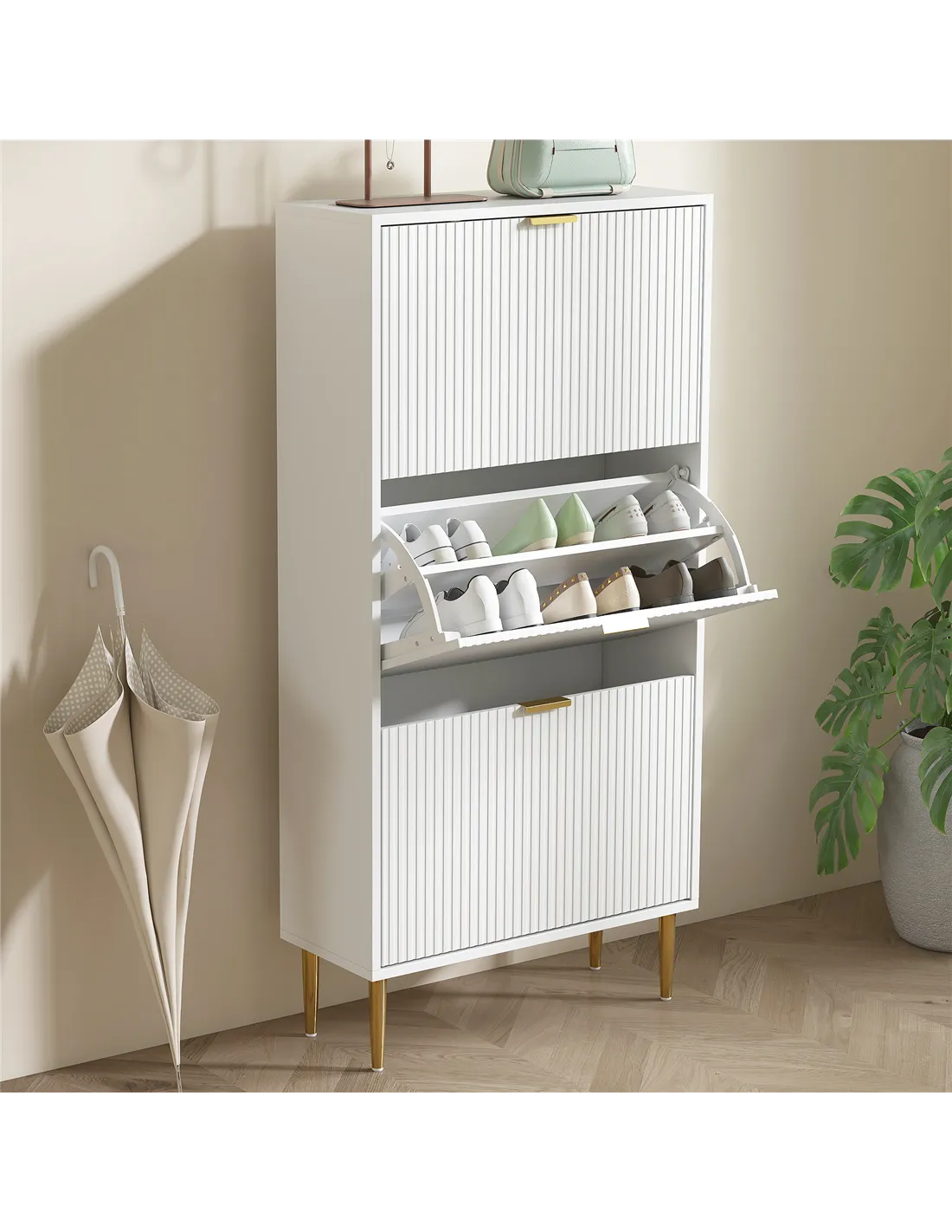 The HOMCOM narrow shoe cabinet with three flip drawers is an ideal storage solution for compact spaces such as hallways, entrances, or bedrooms. Its slim profile fits neatly into narrow gaps, helping to maintain a clutter-free environment. The adjustable shelves accommodate various footwear types, from trainers and heels to ankle boots, making it versatile for family use. Place it near your front door to keep everyday shoes organised and easily accessible, or use it in a dressing room to protect and display your favourite pairs. The elegant white finish with fluted panels and gold-tone handles adds a touch of sophistication, complementing modern and classic interiors alike.