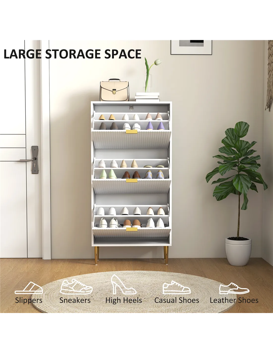 - Three flip drawers can store up to 18 pairs of shoes