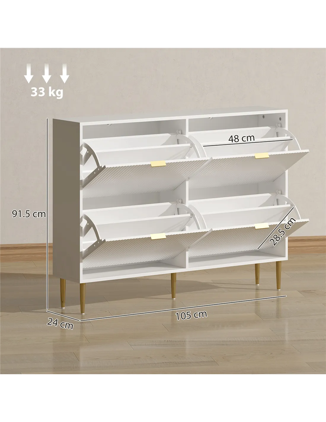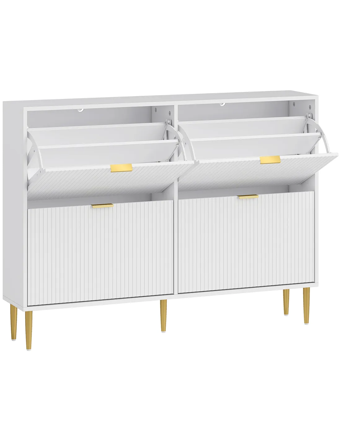 The HOMCOM narrow shoe cabinet with four flip drawers is an ideal solution for compact spaces such as hallways, corridors, or bedrooms where efficient storage is essential. Its slim profile fits neatly against walls, making it perfect for keeping footwear organised without occupying much floor space. Adjustable shelves allow you to store a variety of shoes, from trainers and heels to ankle boots, while the 15 cm bottom clearance offers additional room for slippers or smaller pairs. The elegant white finish with fluted panels and gold-tone handles complements modern and classic interiors alike, adding a touch of sophistication to your home entrance or dressing area. For families, the included anti-tip kit ensures safety, making it suitable for homes with children or pets.