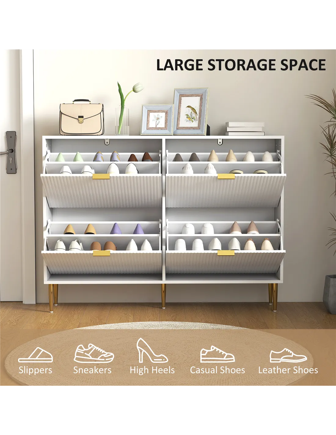 - Four flip drawers can store up to 20 pairs of shoes